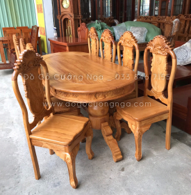 Bàn ăn hình oval luôn mang nét đẹp đầy thanh lịch và tao nhã. Khi kết hợp với chất liệu gỗ gõ đỏ, mẫu bàn ăn lại càng trở nên độc đáo và cuốn hút. Mặt bàn được thiết kế đơn giản với hình ovan kích thước lớn dùng cho 8 người. Chân bàn được điêu khắc tinh xảo hoa văn tân cổ điển đầy tinh tế, pha chút nghệ thuật. Các mẫu ghế ăn có hoa văn trên từng phần tựa lưng, mang đến nét đẹp đầy quý phái.