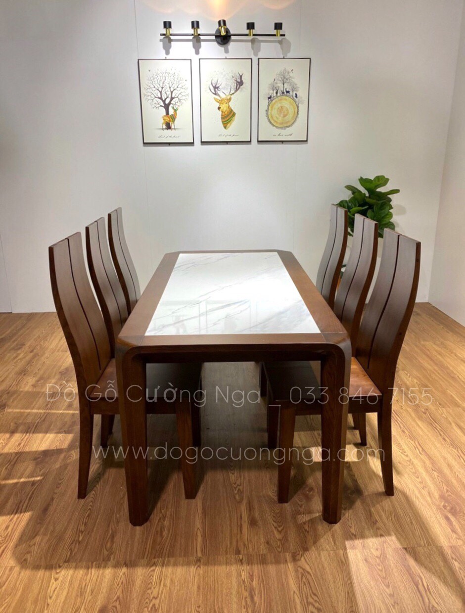 Bộ bàn ăn gỗ sồi nga mặt đá 6 ghế - màu óc chó giá rẻ đẹp