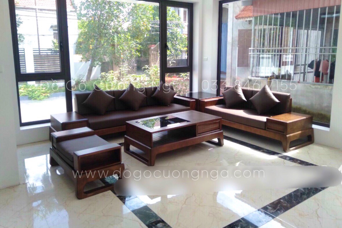Bộ Sofa Gỗ Sồi Nga Góc L Chân Thuyền 2m8x1m9 Màu Óc Chó Sang Trọng