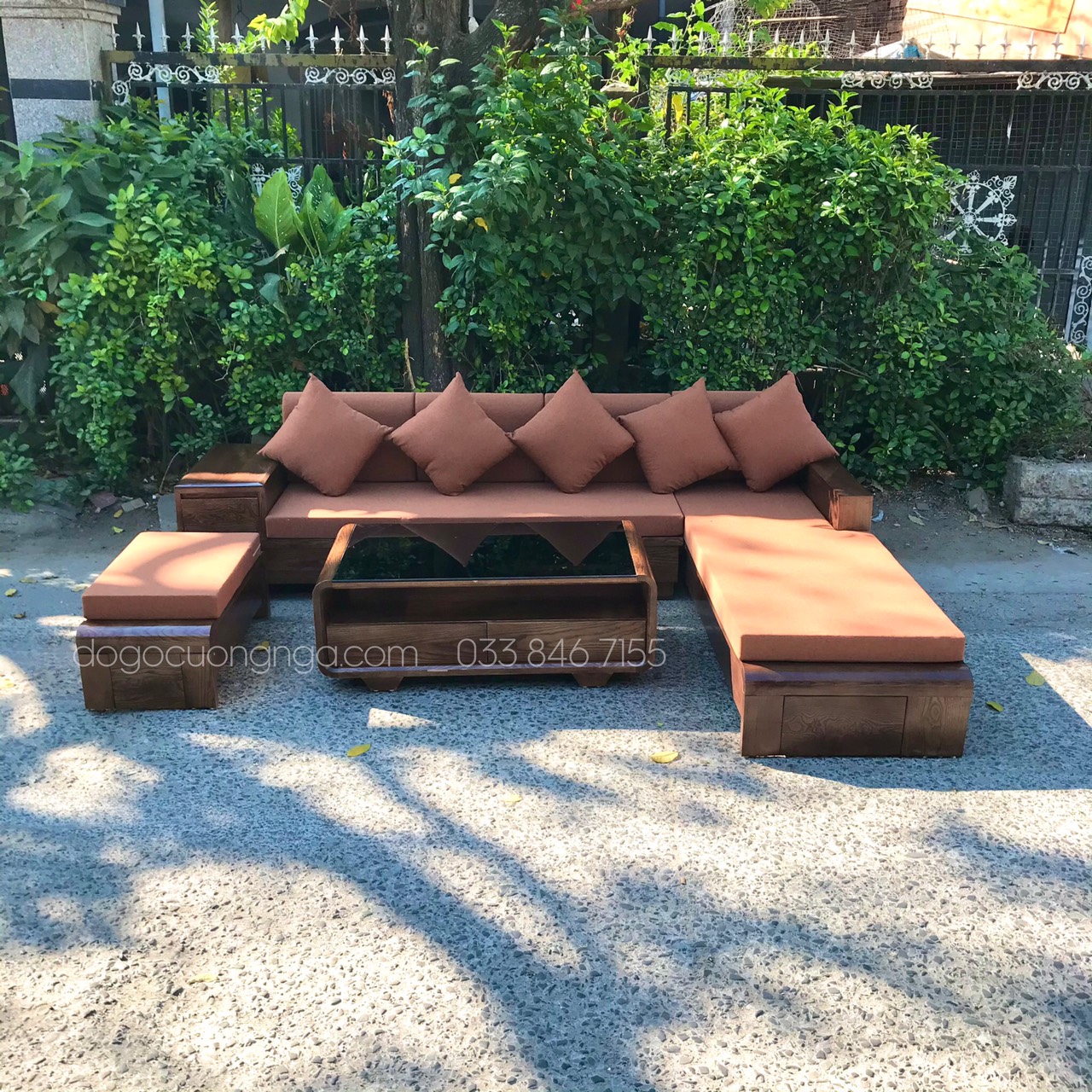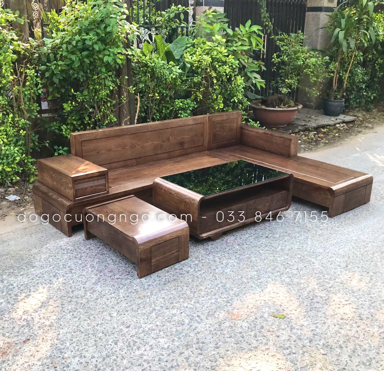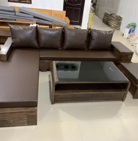 Bộ Sofa Gỗ Sồi Nga Góc L Chân Thuyền 2m8x1m9 Màu Óc Chó Sang Trọng