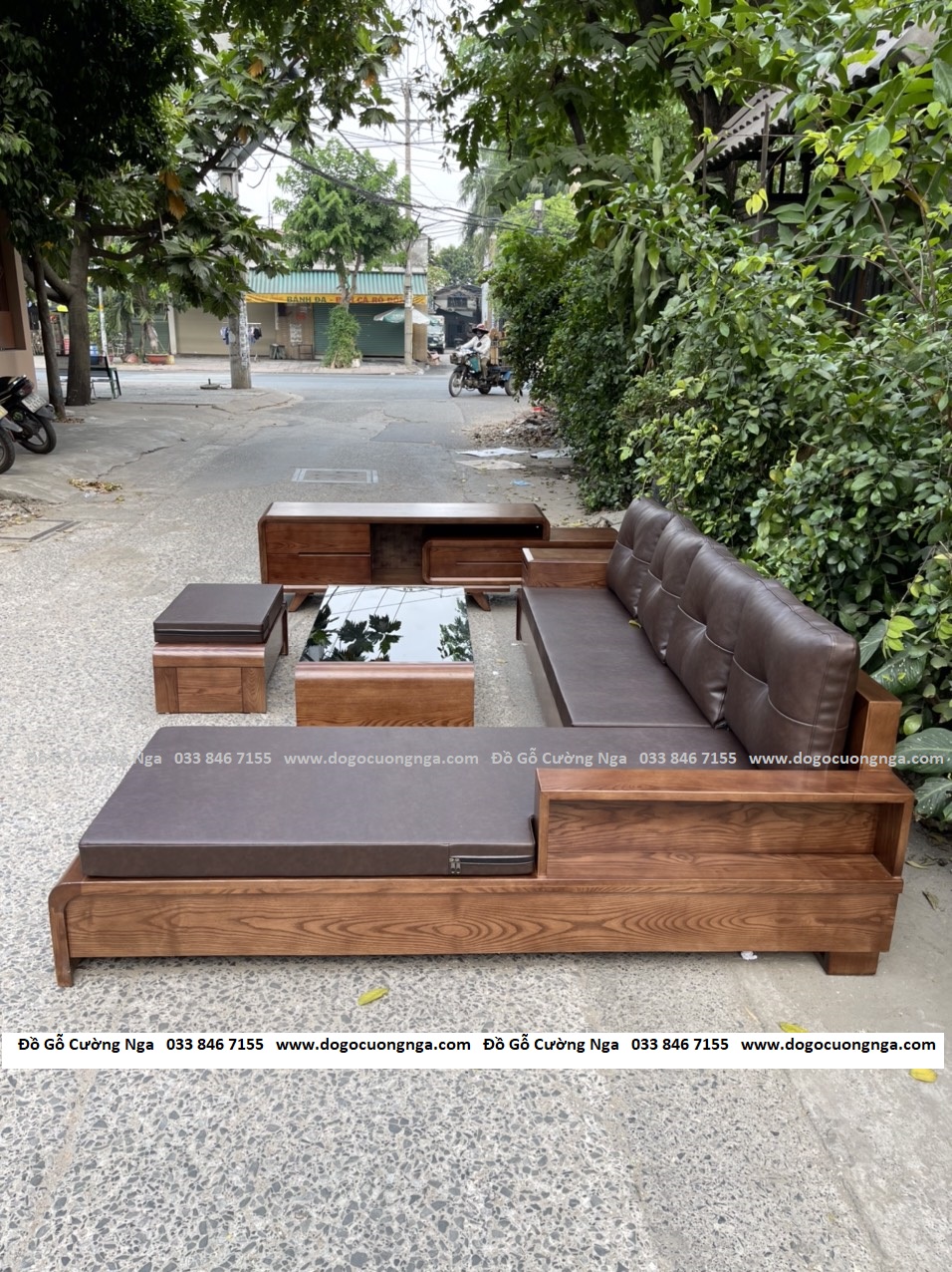 Bộ Sofa Gỗ Sồi Nga Góc L Chân Thuyền 2m8x1m9 Màu Óc Chó Sang Trọng