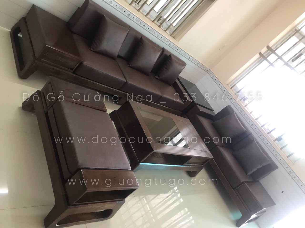 Bộ Sofa Gỗ Sồi Nga Góc L Chân Thuyền 2m8x1m9 Màu Óc Chó Sang Trọng