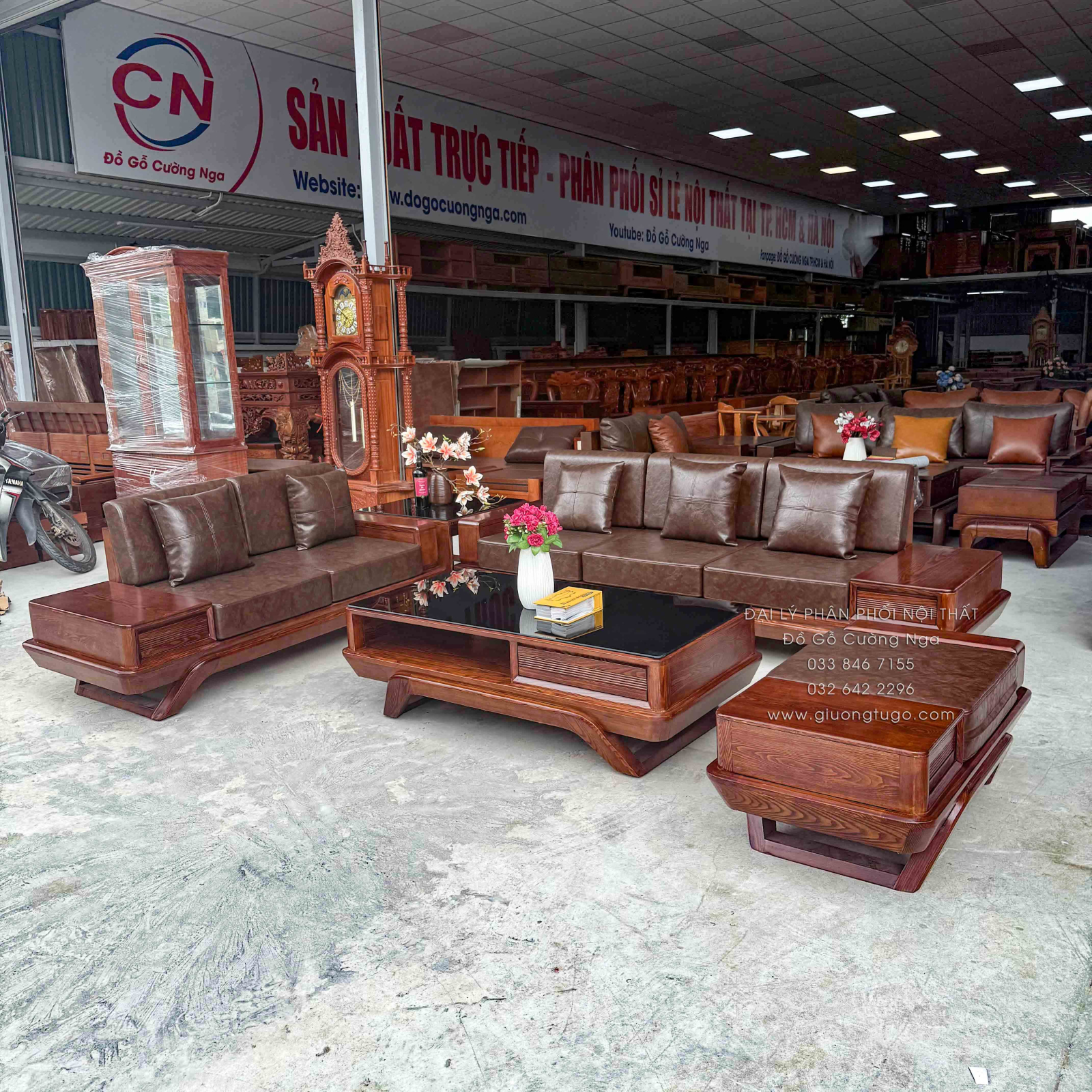 Bộ Sofa Gỗ Sồi Nga 2 Văng Chân Thuyền 3m3x2m6 Màu Óc Chó Cao Cấp