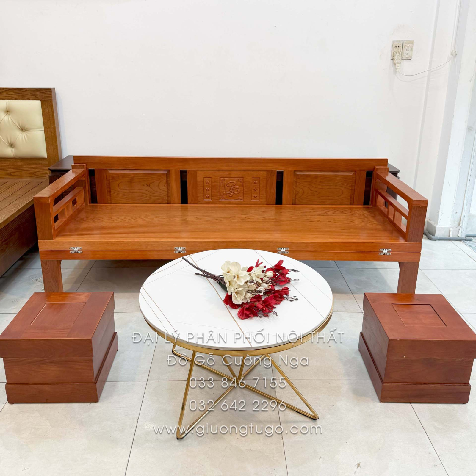 Giường Gấp Gỗ Xoan Đào Kèm Bàn Đá Và Đôn Gỗ Sồi Đẹp Gọn