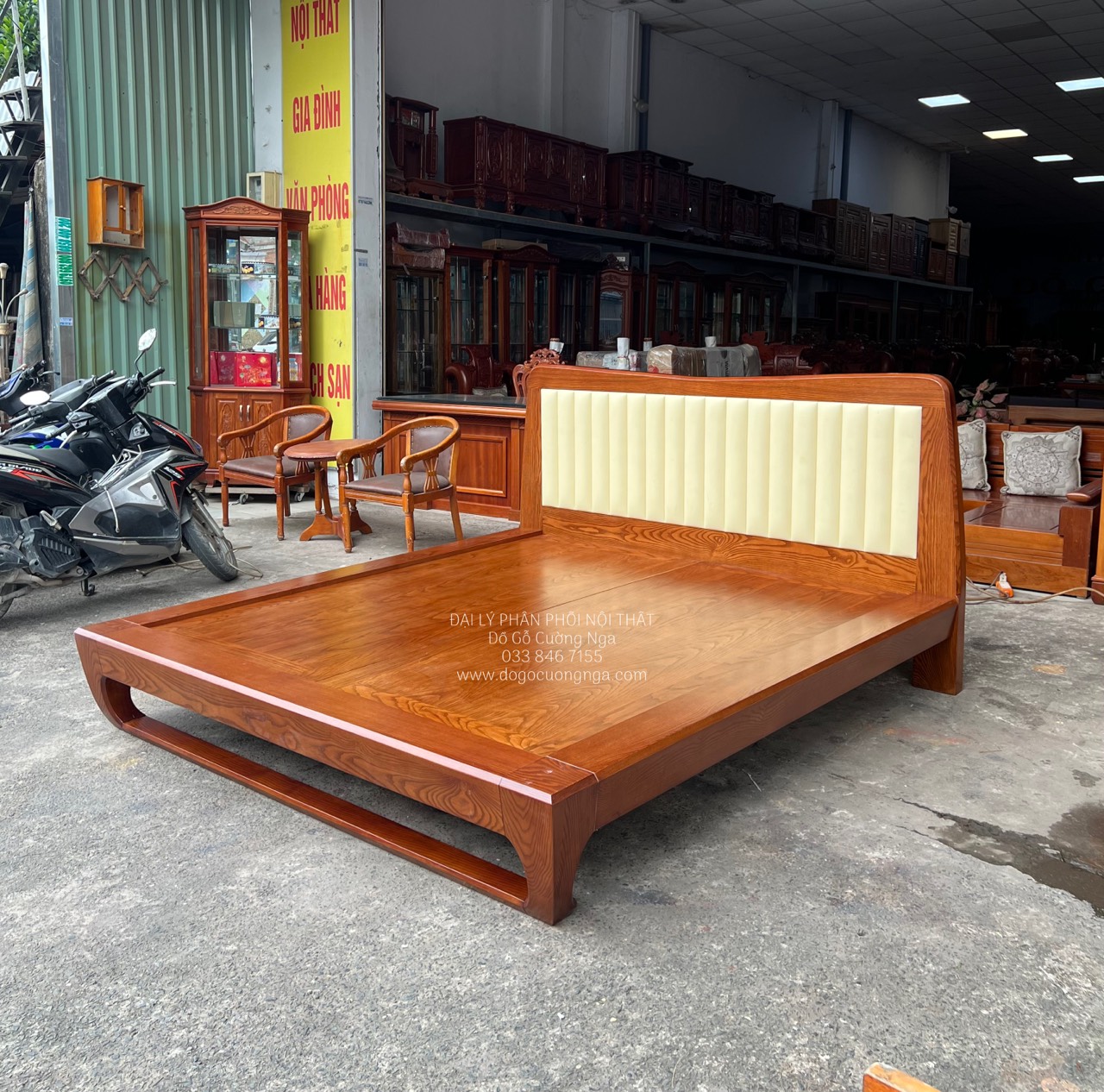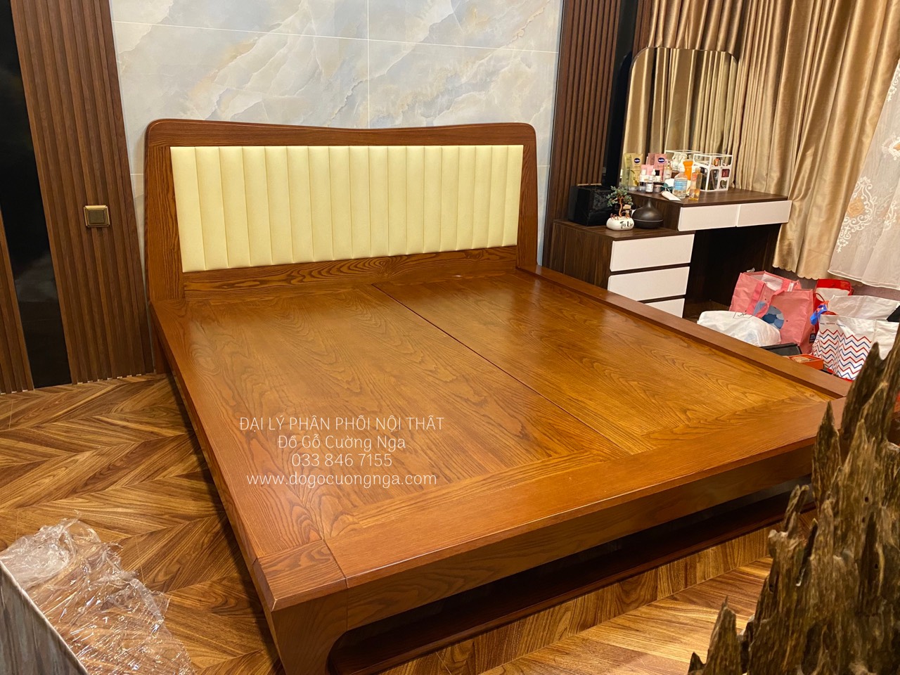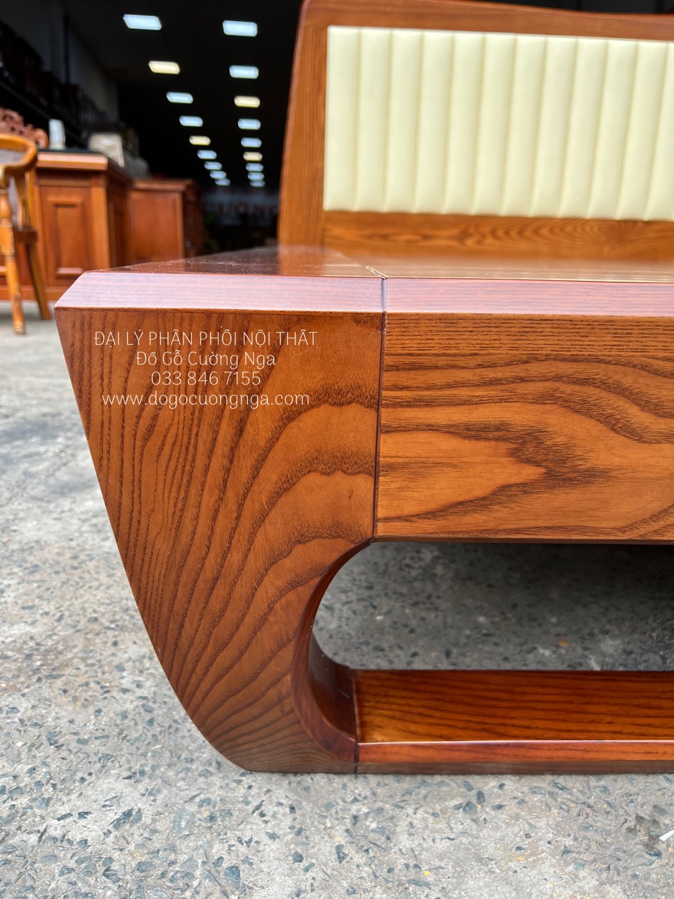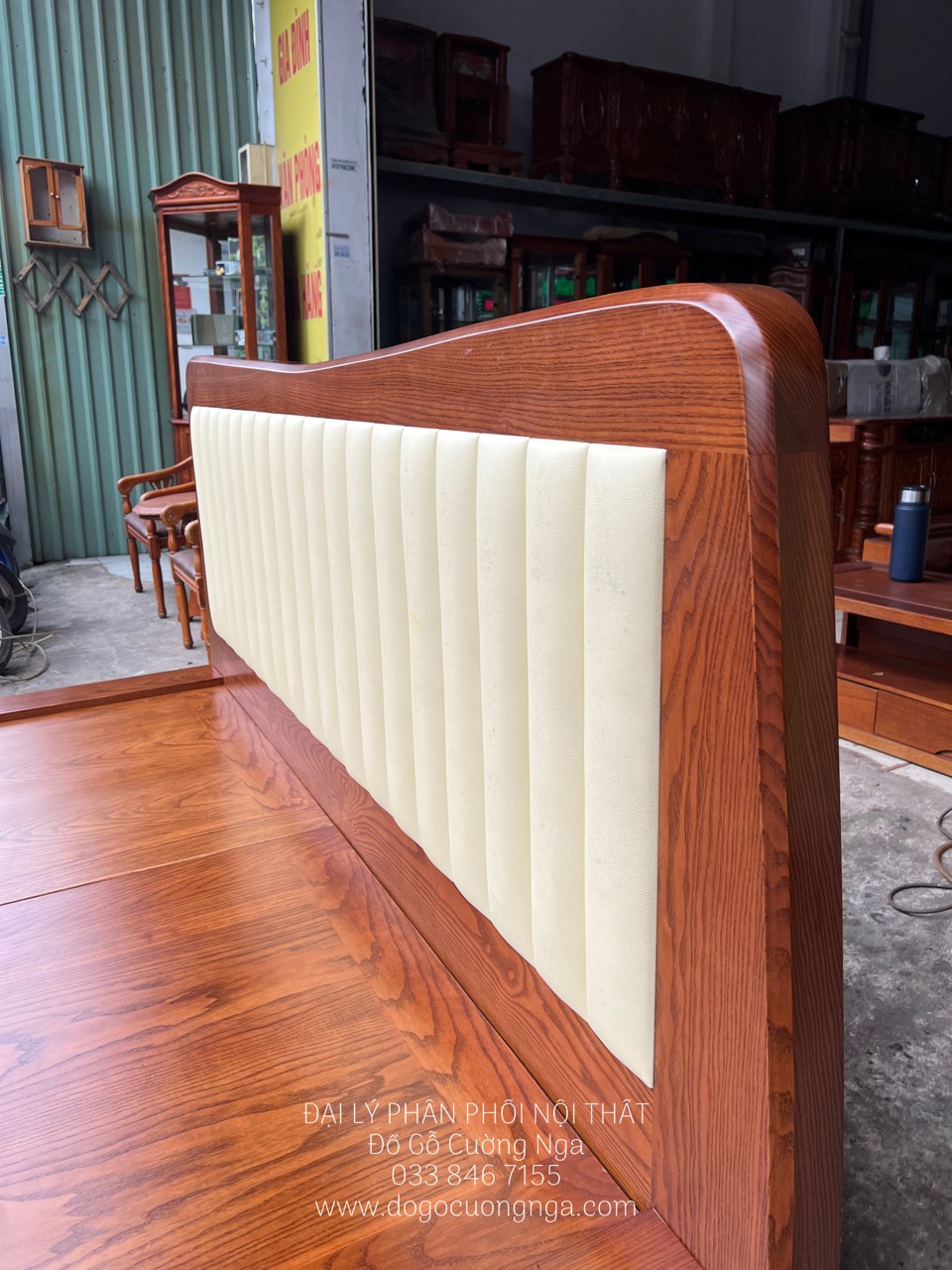 Giường gỗ lấy cảm hứng từ những đường cong mềm mại, cho ra một tác phẩm tuyệt vời. Phần chân giường người thợ mộc sử dụng kỹ thuật vanh gỗ, tạo ra dáng chân quỳ cách điệu tinh tế. Phía đầu giường là sự kết hợp hài hoà giữa chất gỗ và chất liệu da cao cấp. Đầu giường bọc da giúp cho chiếc giường ngủ trở nên sang trọng, mang đến cho người dùng cảm giác mềm mại trong suốt quá trình sử dụng.