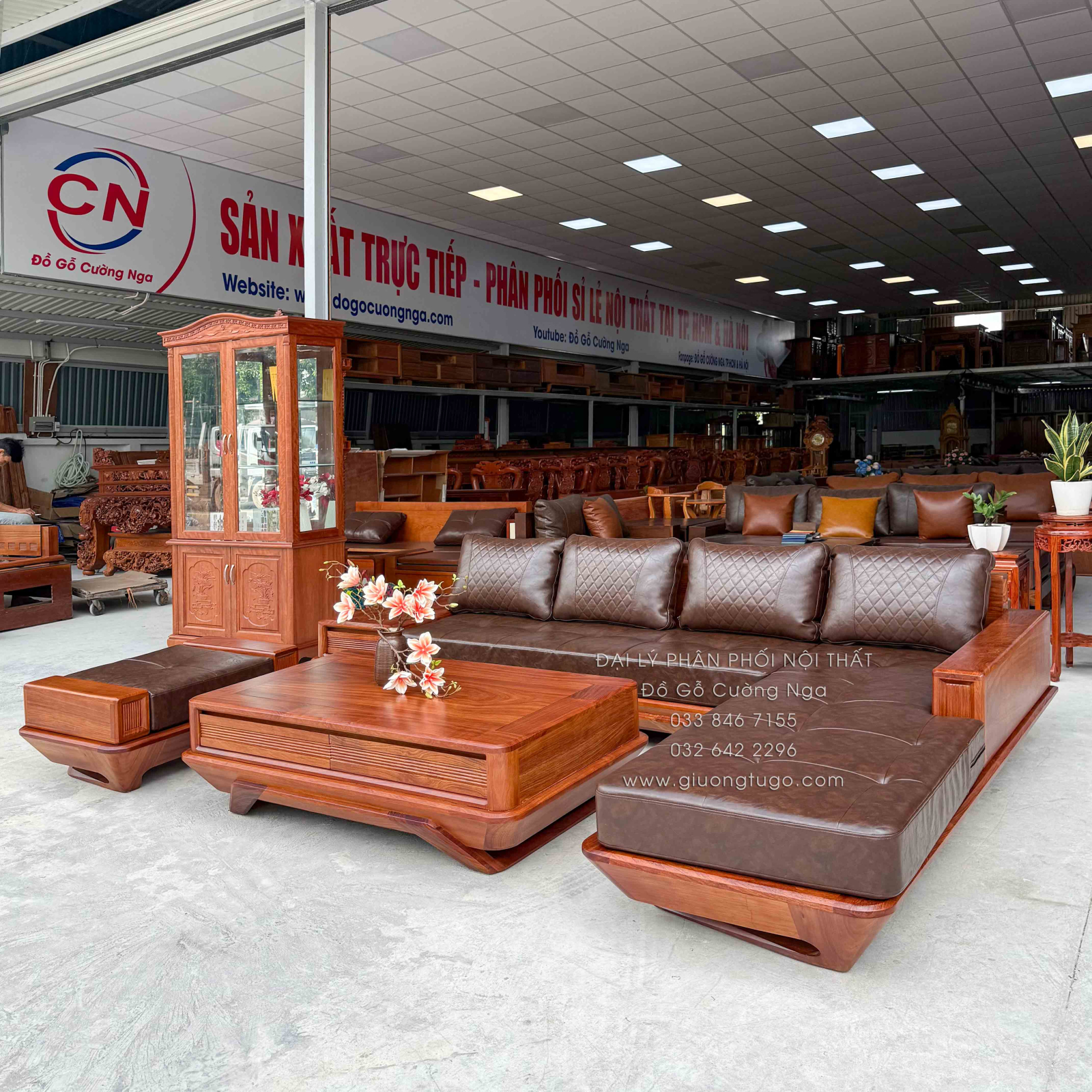 Bộ Sofa Gỗ Sồi Nga Góc L Chân Thuyền 2m8x1m9 Màu Óc Chó Sang Trọng