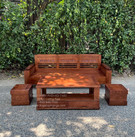 Mẫu sofa có thiết kế 3 chỗ ngồi đơn giản kèm bàn và đôn ngồi và điểm nhấn nổi bật là phần tay ghế có hộc đề đồ tiện lợi, kèm theo đó màu sofa gỗ được sơn màu óc chó mang đến sự sang trọng cho phòng khách gia đình.