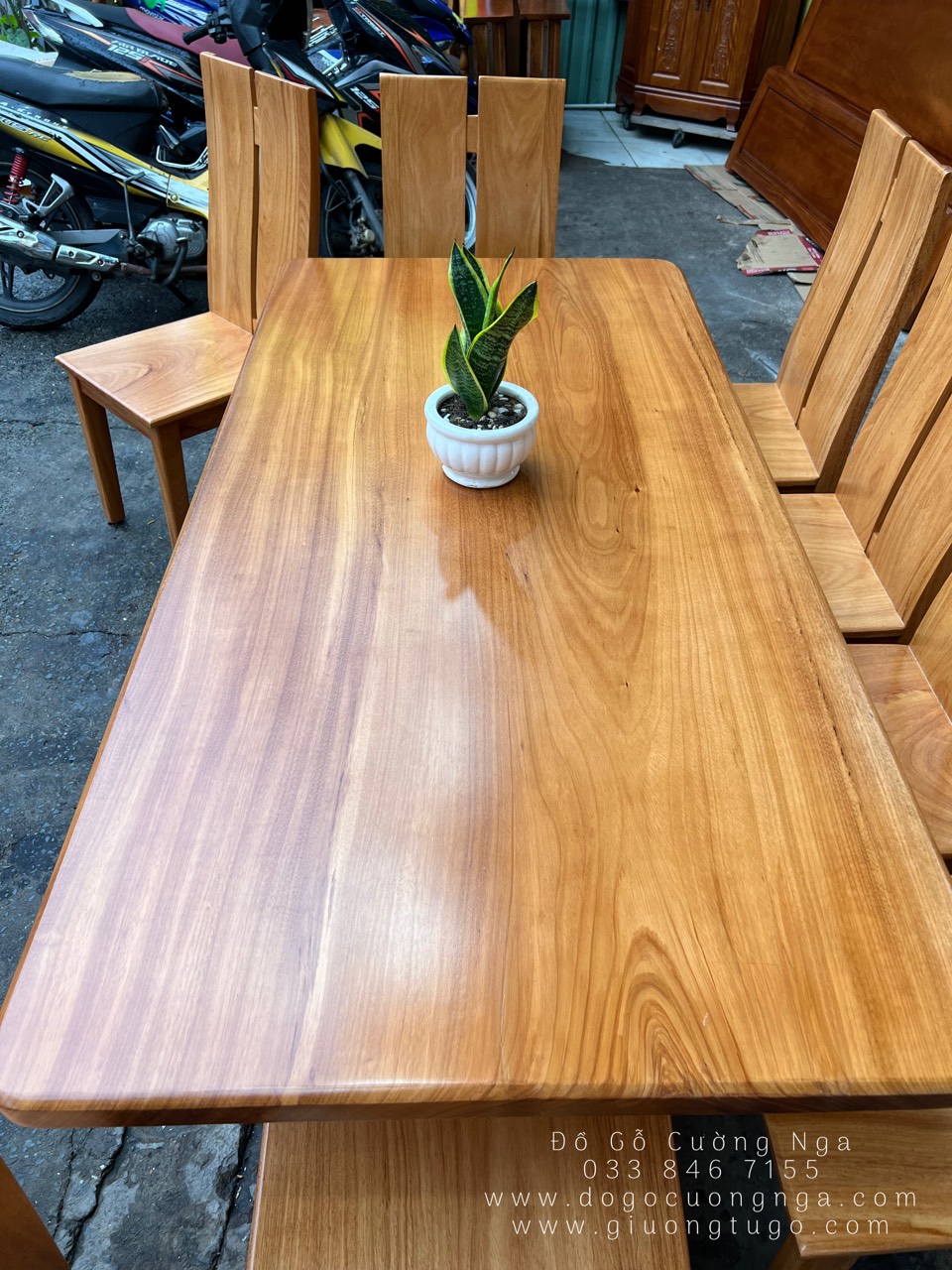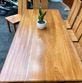 Bàn ăn gỗ gõ đỏ mặt liền nguyên tấm 4cm có màu đậm, màu sắc chuyển từ đỏ sang vàng nâu. Màu gỗ khá đồng đều, không có sự chênh lệch giữa các giác gỗ.