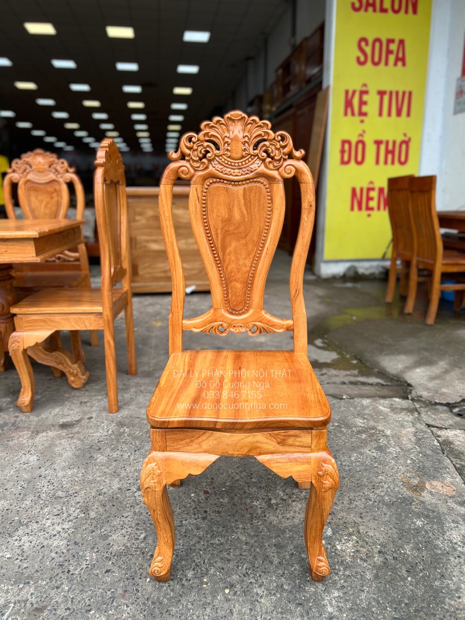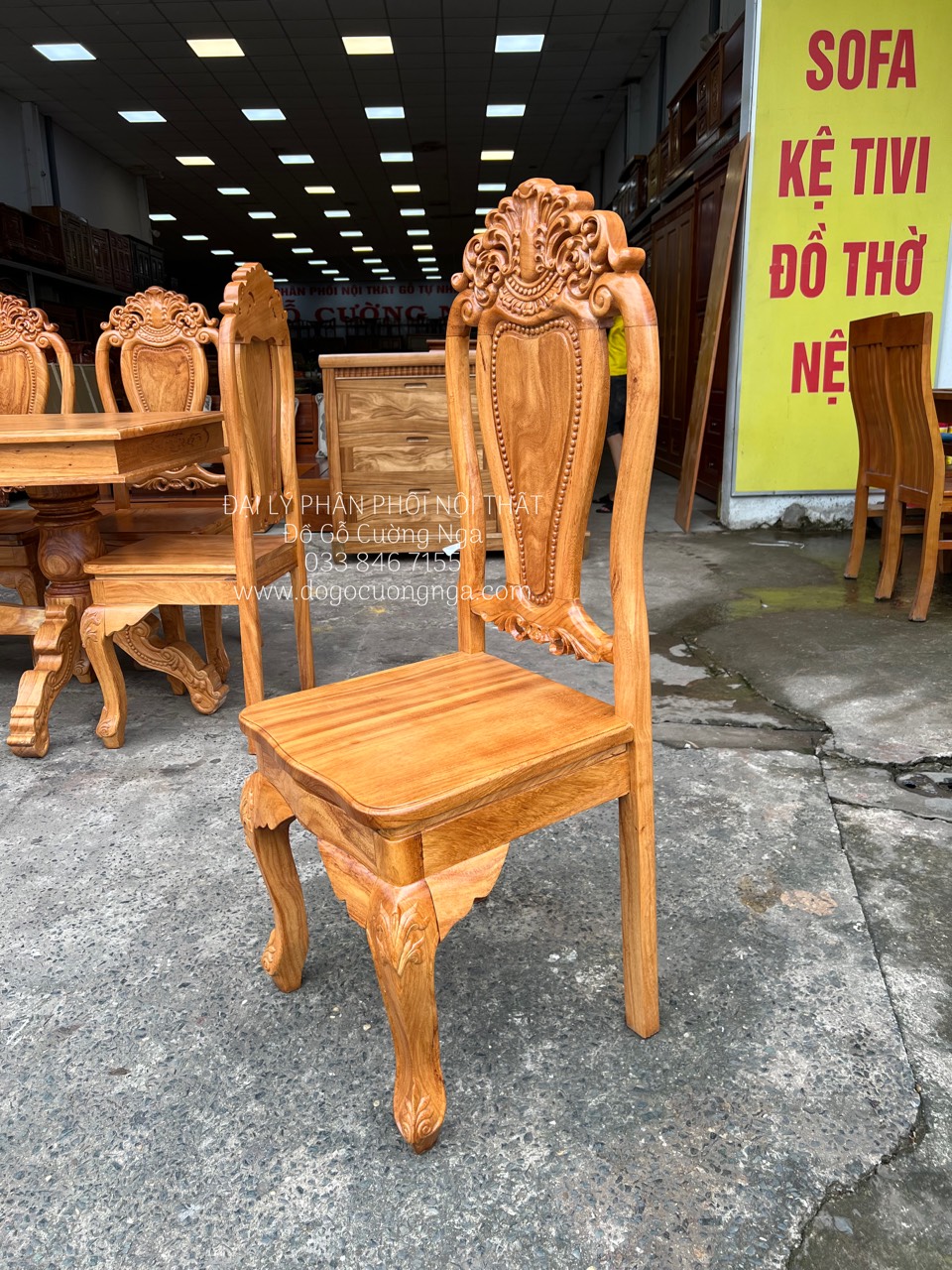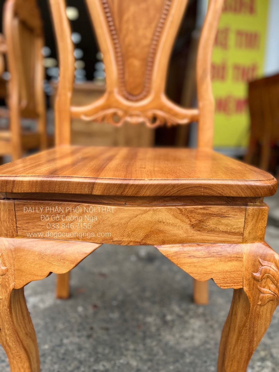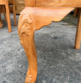 Ghế ăn với thiết kế cầu kỳ, các chi tiết hoa văn trạm khắc trên khung gỗ được chạm khắc bởi đôi tay khéo léo của những người thợ lành nghề. Các họa tiết trên khung gỗ được trạm khắc tỉ mỉ, khéo léo mang lại cho bộ bàn ăn 8 ghế một diện mạo hoàn hảo, sang trọng và đẳng cấp.