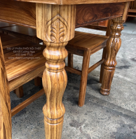 Bàn ăn được làm bằng chất liệu gỗ hương xám tự nhiên, những chi tiết quan trọng như chân bàn, chân ghế đều được chọn lựa những khối gỗ dày đặc, chất lượng nhất để tạo ra. Chính vì thế bộ bàn ăn gỗ hương xám vô cùng chắc chắn và cứng cáp.