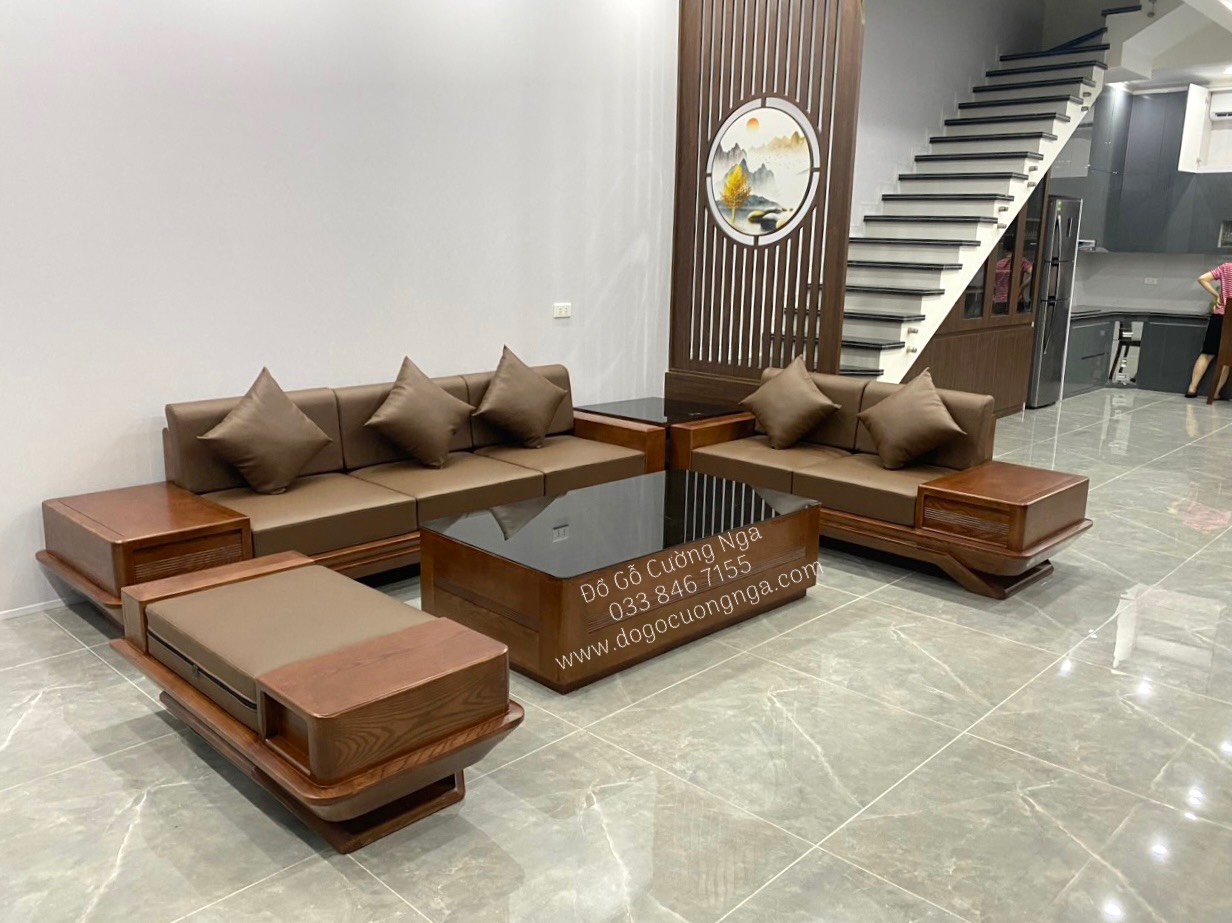 Bộ Sofa Gỗ Sồi Nga Góc L Chân Thuyền 2m8x1m9 Màu Óc Chó Sang Trọng