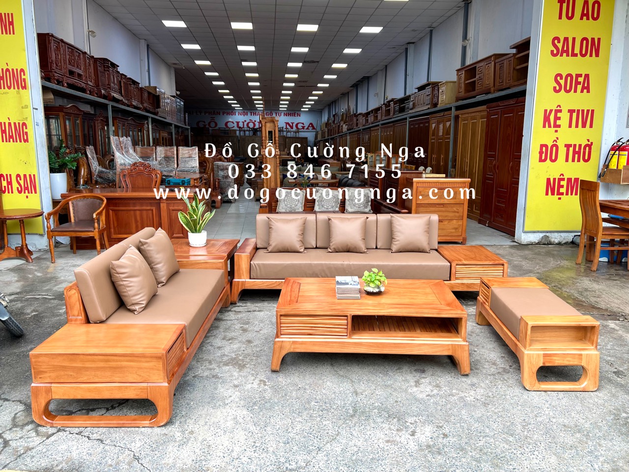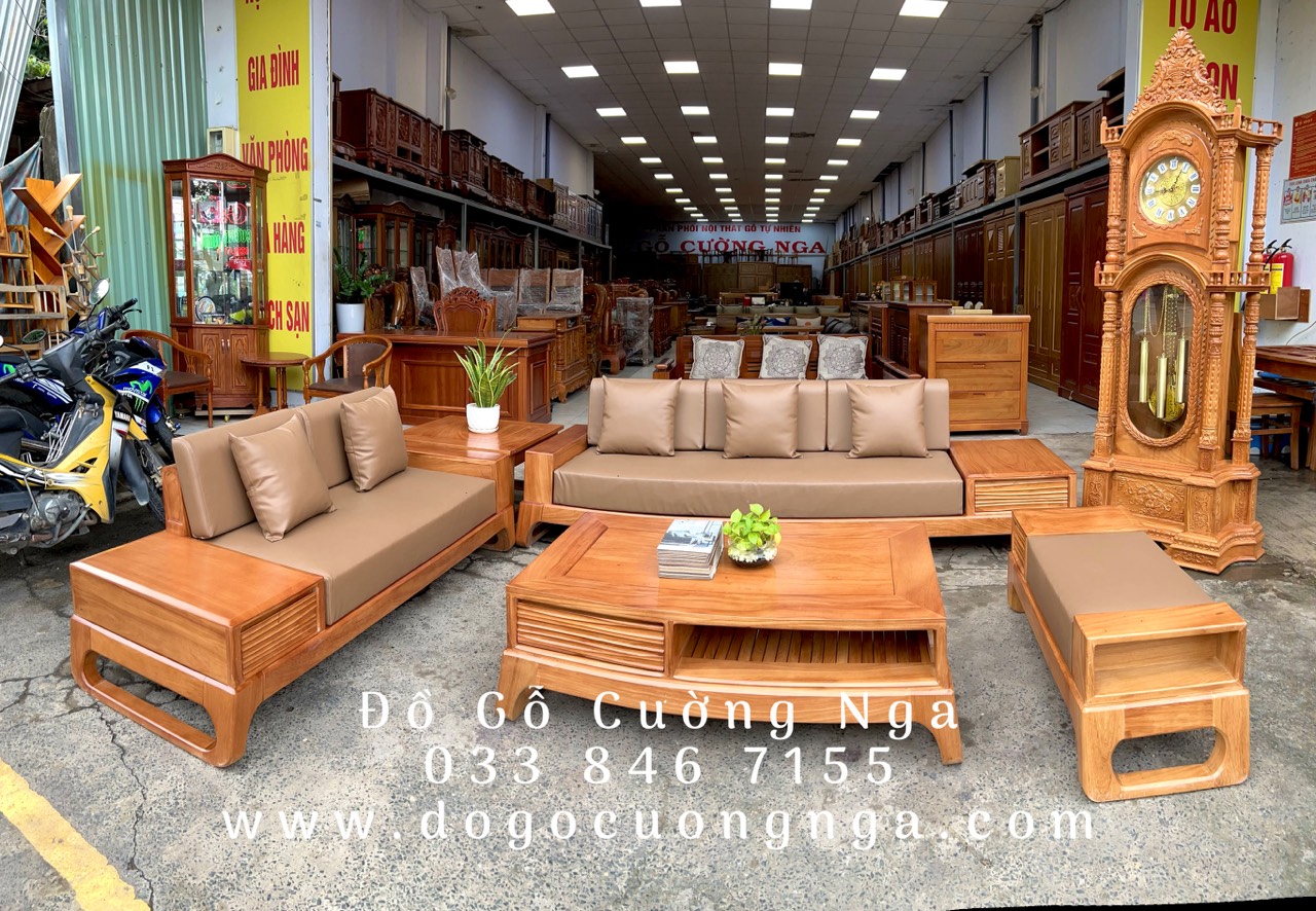 Bộ Sofa Gỗ Sồi Nga Góc L Chân Thuyền 2m8x1m9 Màu Óc Chó Sang Trọng
