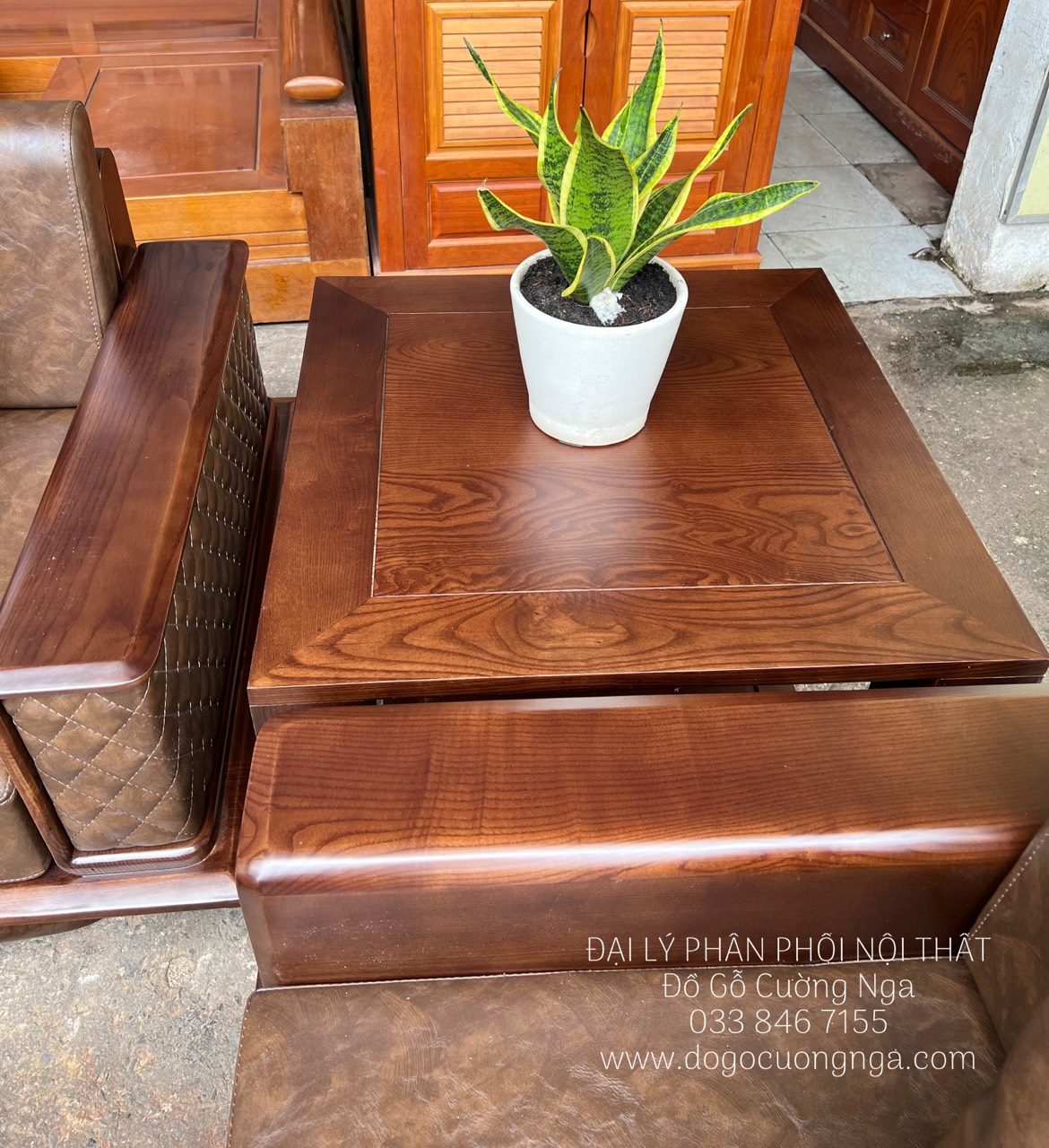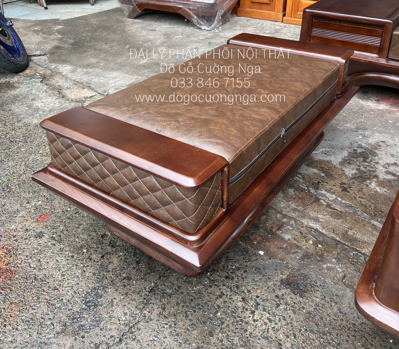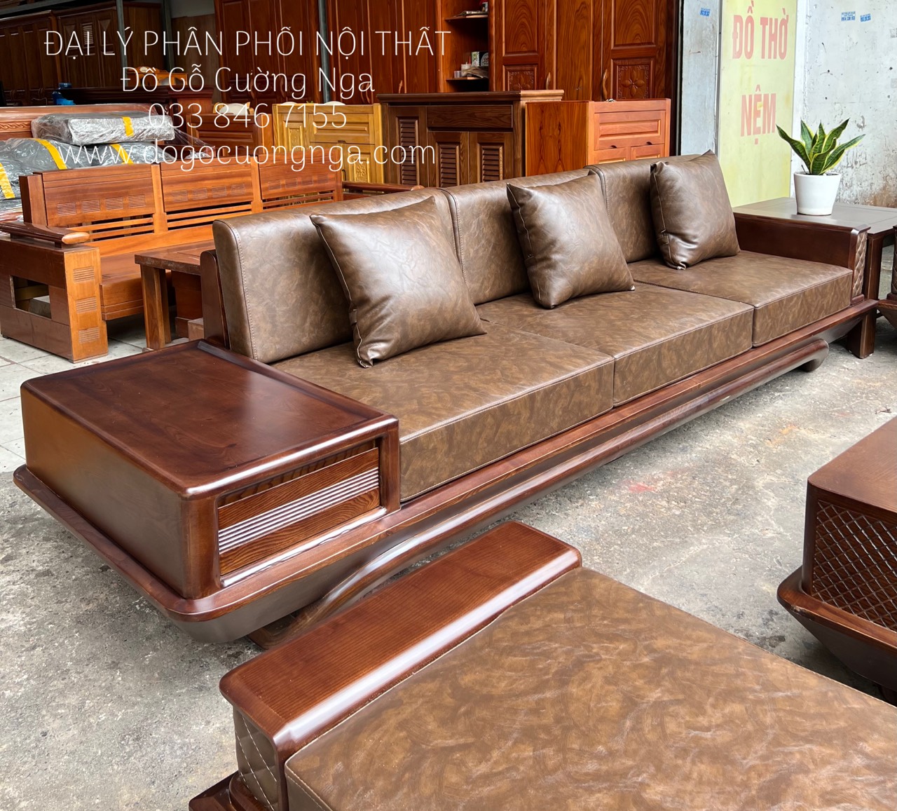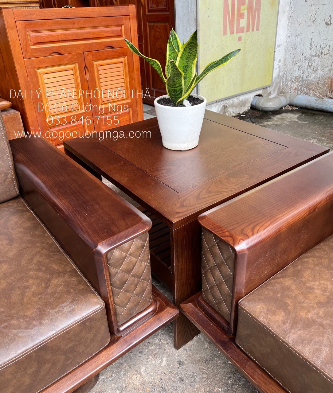 Bàn Ghế Sofa Gỗ Sồi Nga 2 Văng Lau Màu Óc Chó Tay Da Cao Cấp
