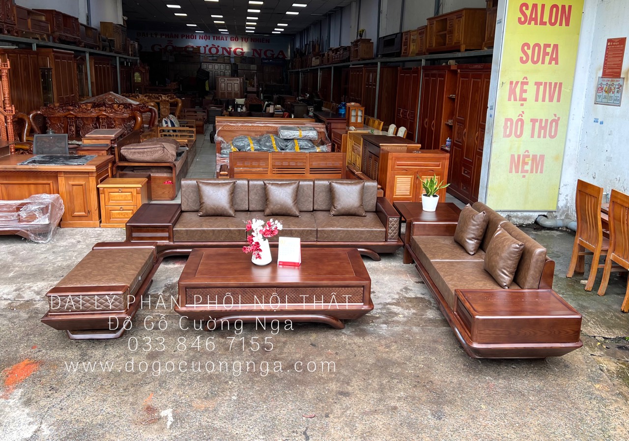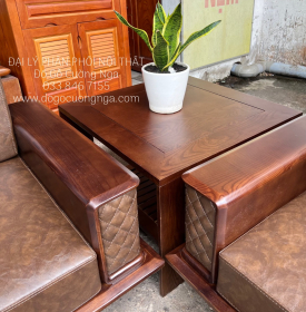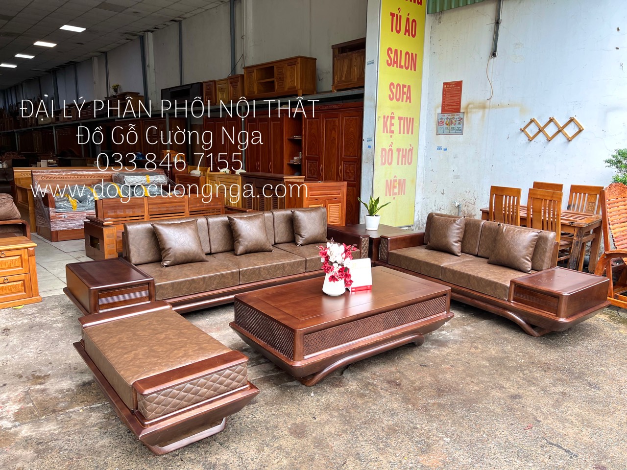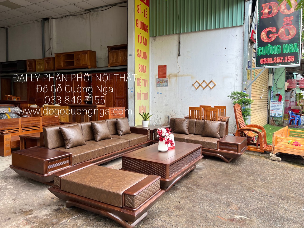 Bàn Ghế Sofa Gỗ Sồi Nga 2 Văng Lau Màu Óc Chó Tay Da Cao Cấp