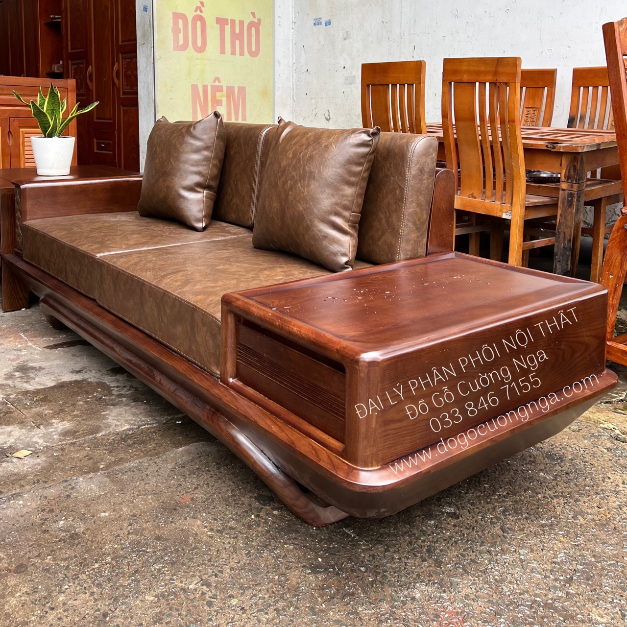 Ghế sofa gỗ sồi 2 văng chân thuyền tay da cao cấp