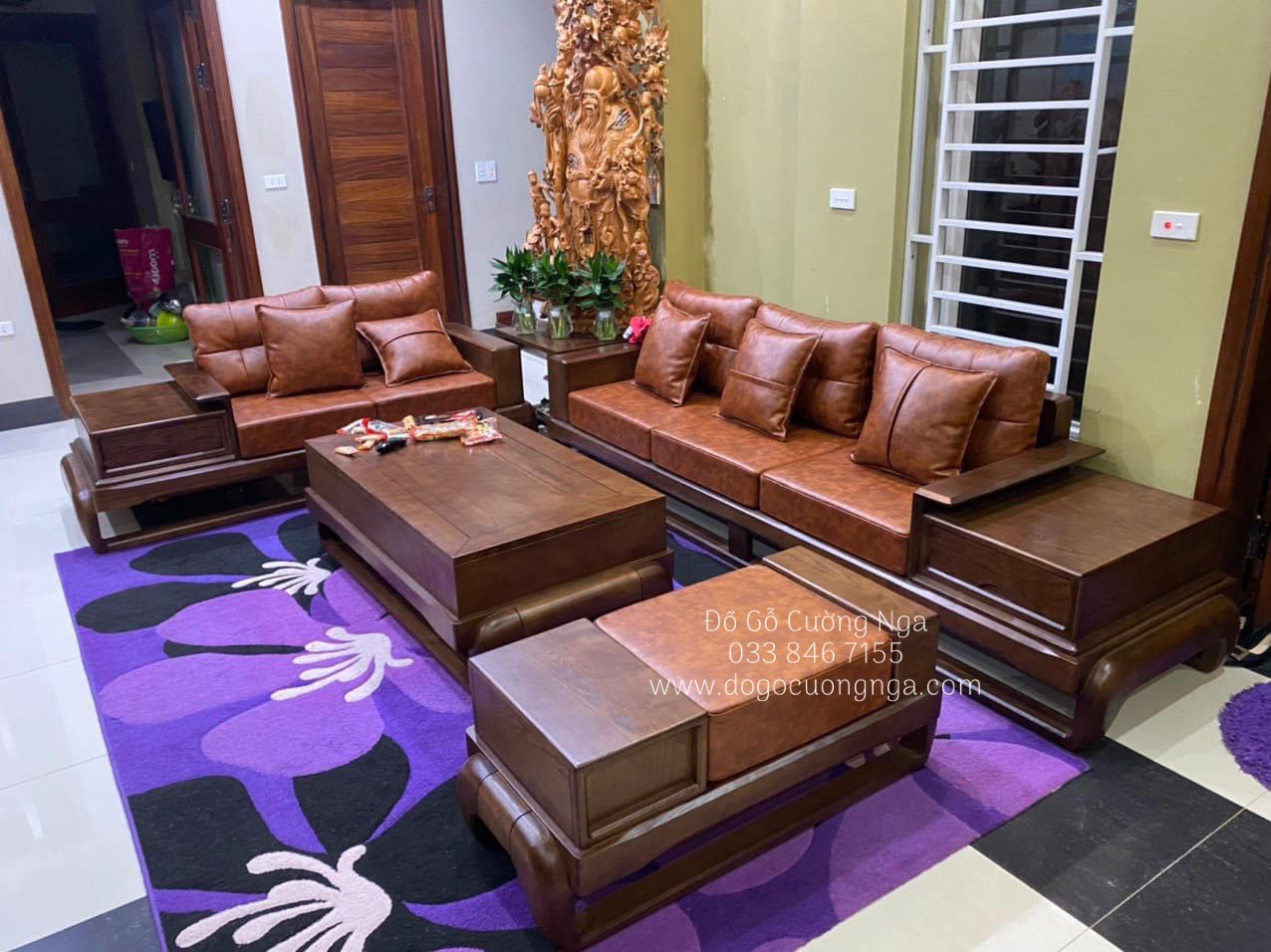 Bàn ghế sofa gỗ sồi nga lau màu óc chó - 2 văng mẫu đùi gà