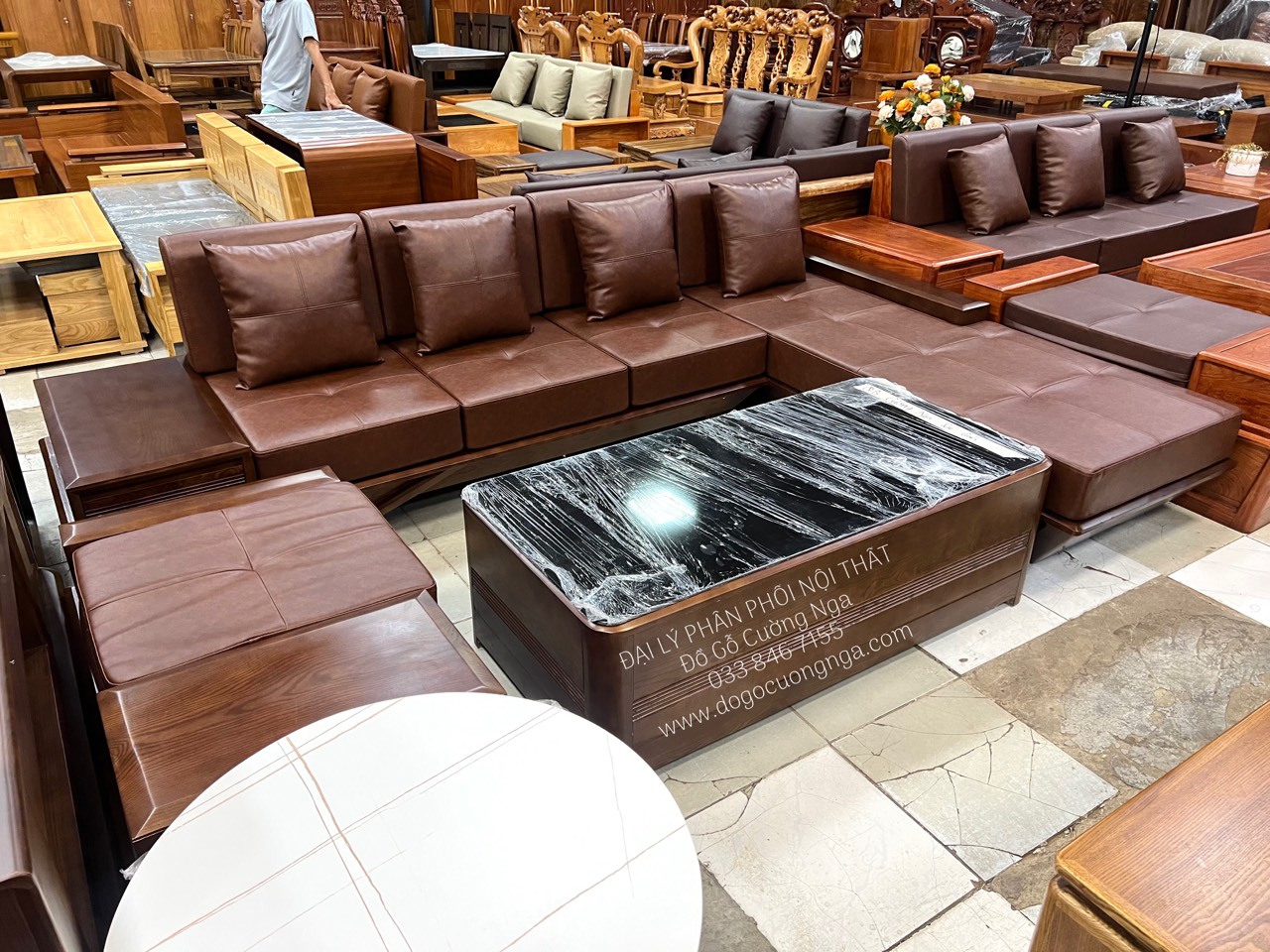 Ghế sofa gỗ sồi thuyền góc L màu óc chó hiện đại