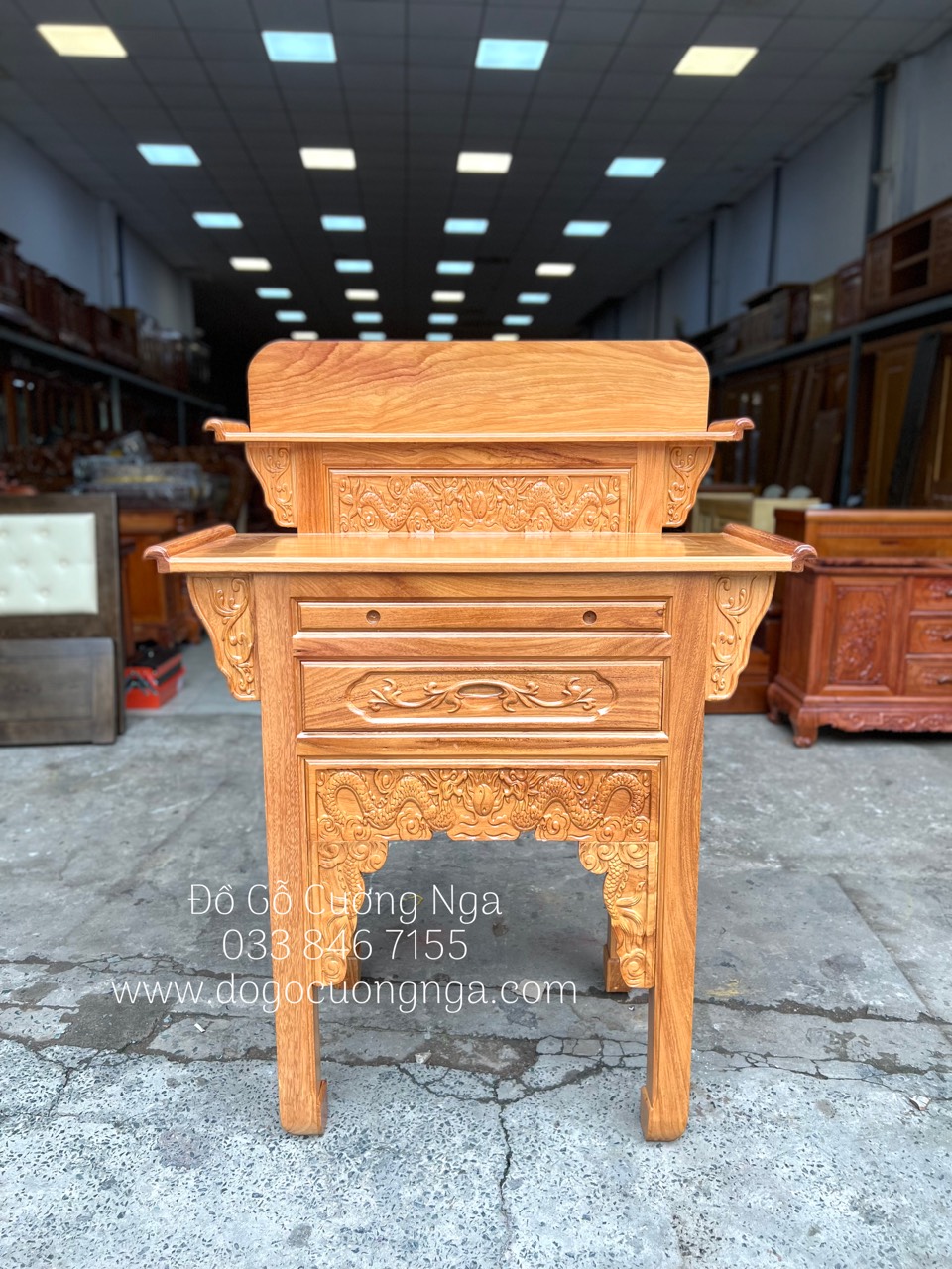 Bàn cúng gõ được thiết kế gồm 2 tầng rộng rãi giúp gia chủ tiện lợi sắp sếp các gian thờ tổ tiên một cách thoải mái hơn. Ngoài ra bàn thờ còn được trang bị một ngăn kéo dày dặn, chắc chắn với kích thước lớn có sức chứa được một mâm cỗ thịnh soạn mà không lo bị gãy hay cong, vênh. 2 hộc tủ riêng biệt, mặt gỗ bên trong sạch sẽ giúp gia chủ yên tâm đặt những vật dụng thờ cúng như nhang, đèn v…v… mà không lo bị mối, mọt xâm hại.