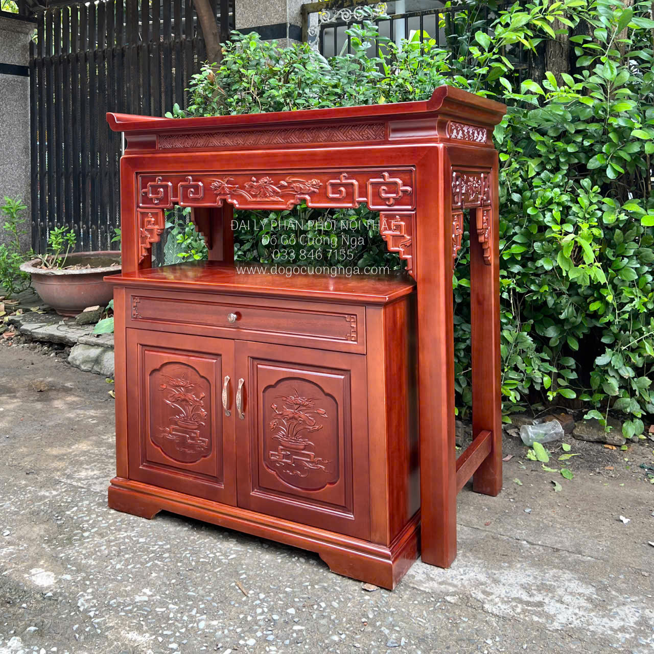 Bàn Thờ Gỗ Xoan Đào 1m07 Kết Hợp Tủ Cơm Trạm Sen Phong Thủy Tài Lộc