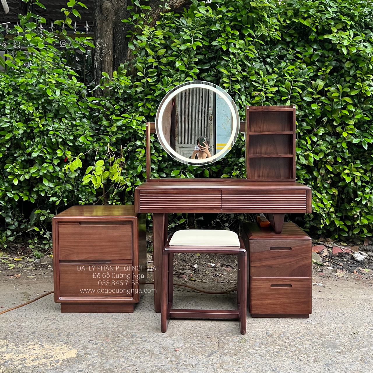 Chi tiết bàn trang điểm gỗ óc chó gương led