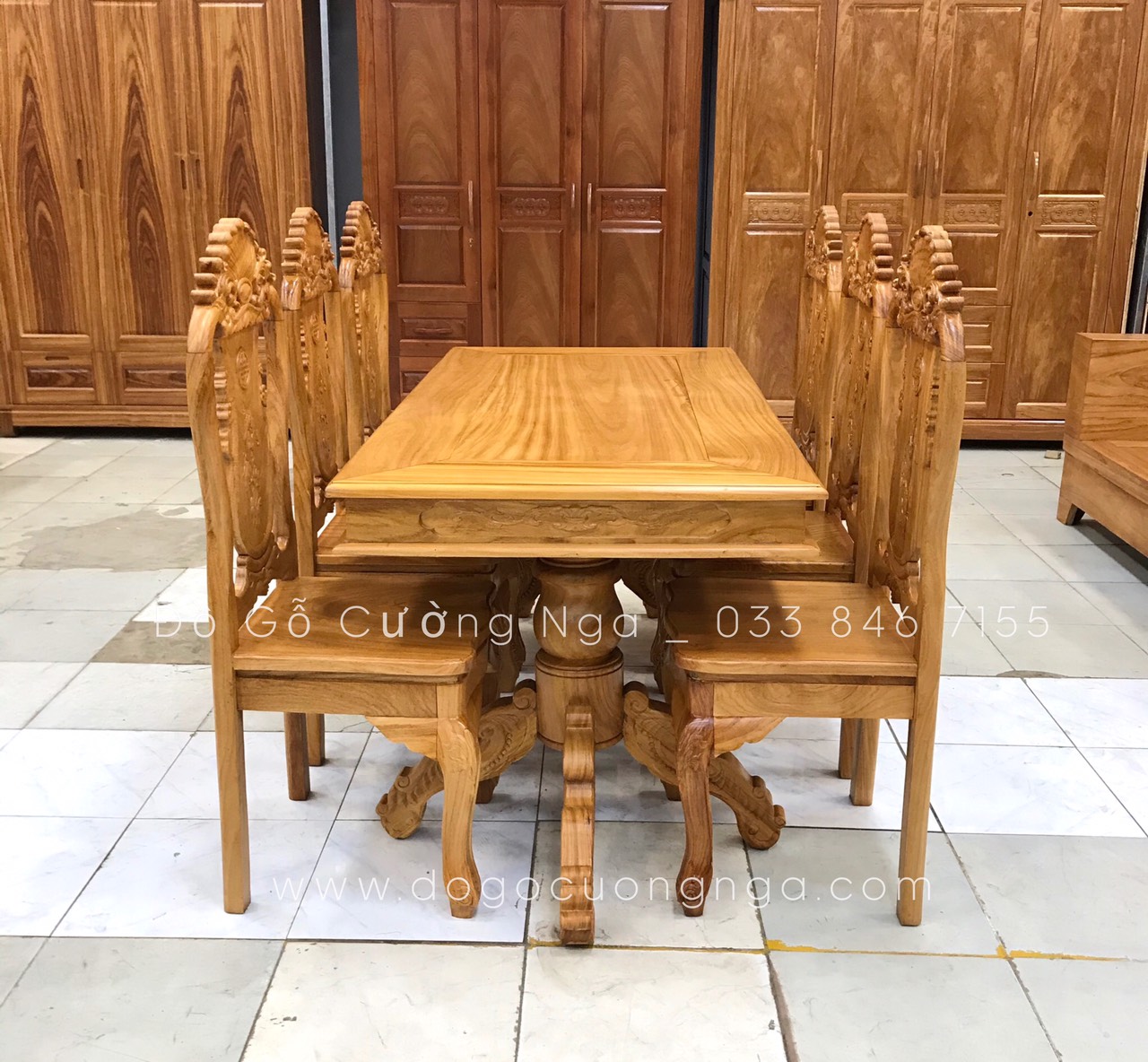 Bộ bàn ăn 6 ghế gỗ gõ đỏ tại Đồ Gỗ Cường Nga bao gồm 6 ghế tựa cao và một bàn dài đều được chạm khắc vô cùng tỉ mỉ, mang trọn ý niệm của người nghệ nhân gỗ.
