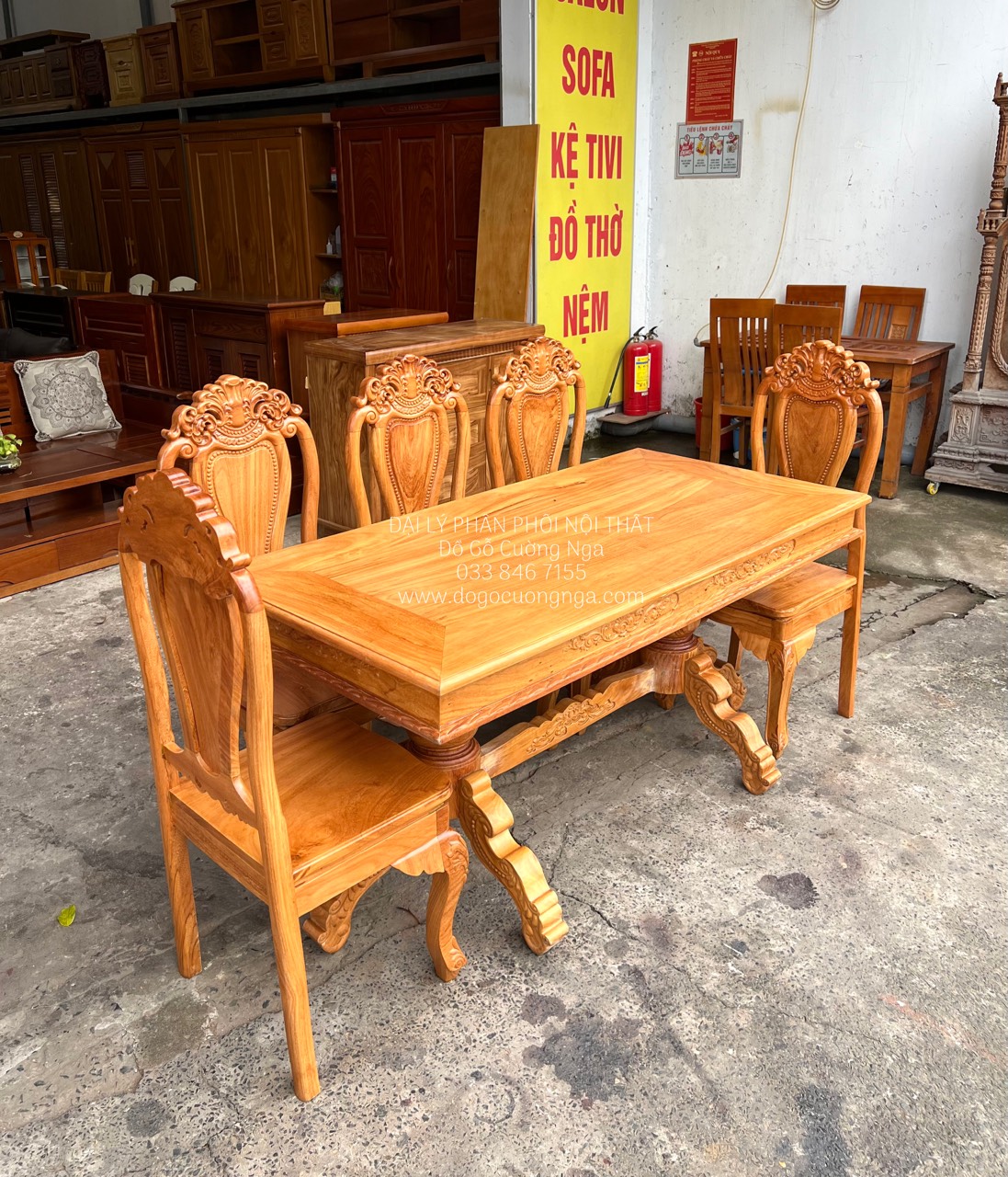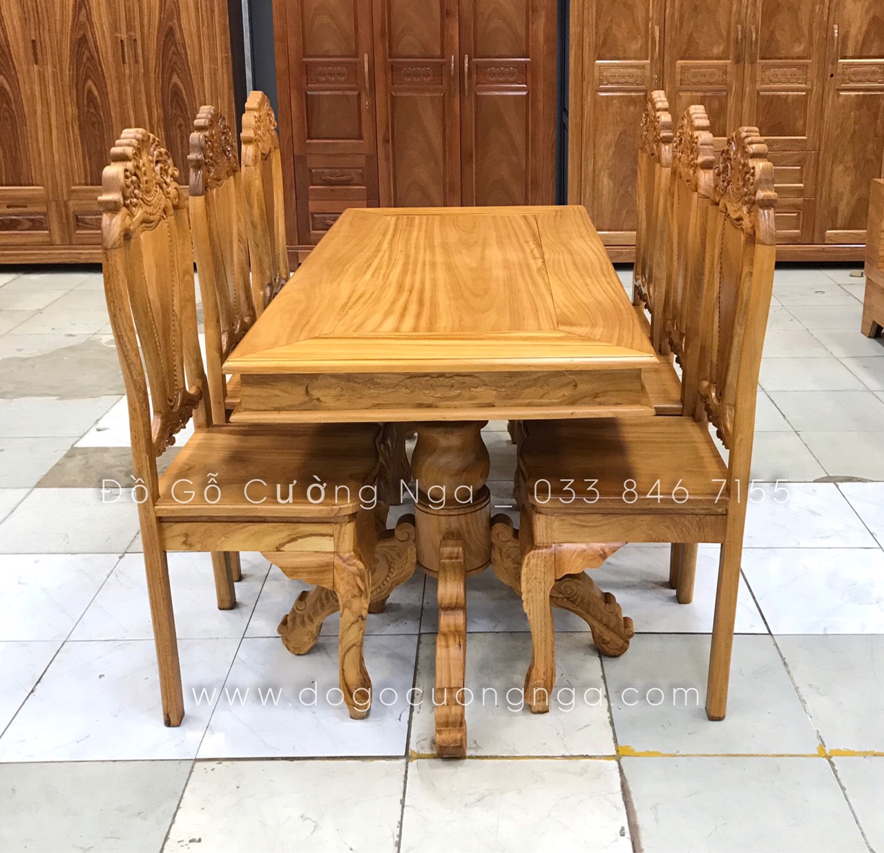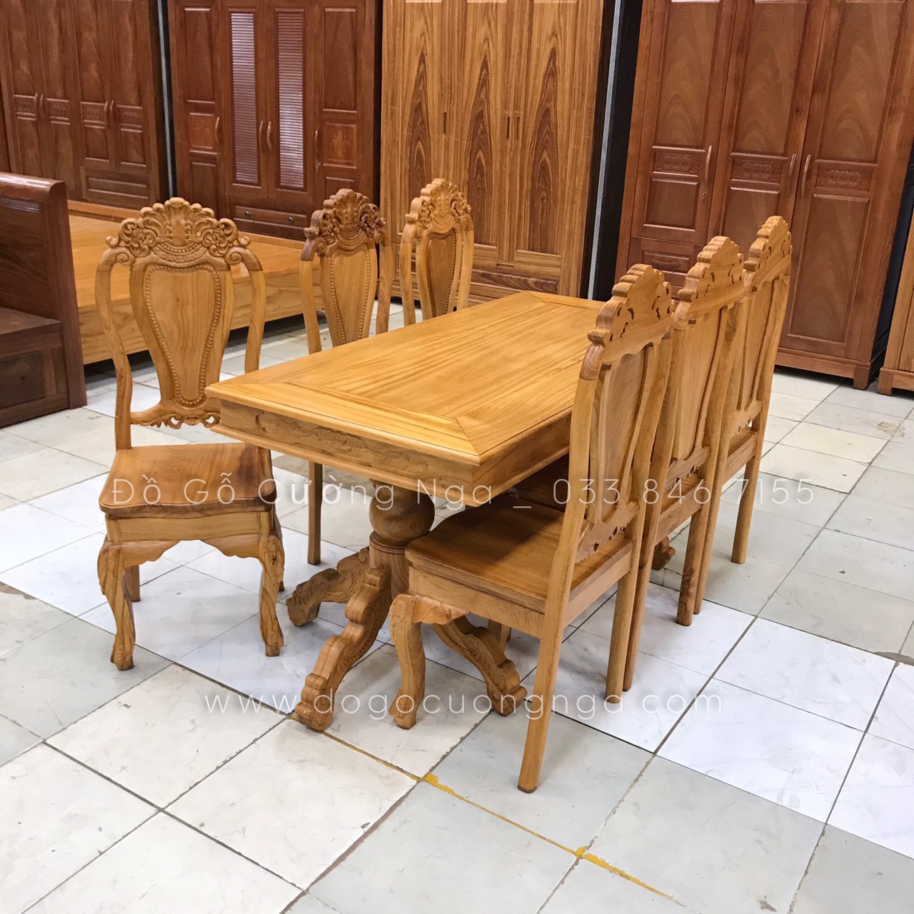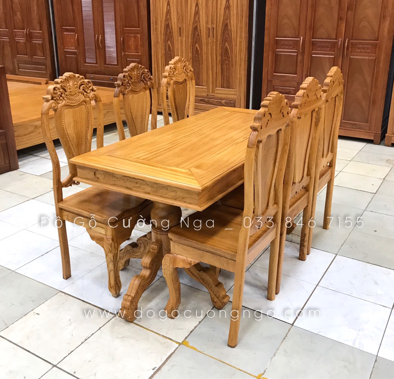 Bộ bàn ăn 6 ghế từ Đồ Gỗ Cường Nga là món nội thất được sản xuất 100% từ chất liệu gỗ gõ đỏ quý hiếm. Đây là loại gỗ được giới chuyên gia nhận xét là một trong những loại gỗ có hệ vân đẹp nhất. Các đường vân không có sự chênh lệch nhiều về màu sắc, tạo ra tổng thể hài hòa cho món nội thất.