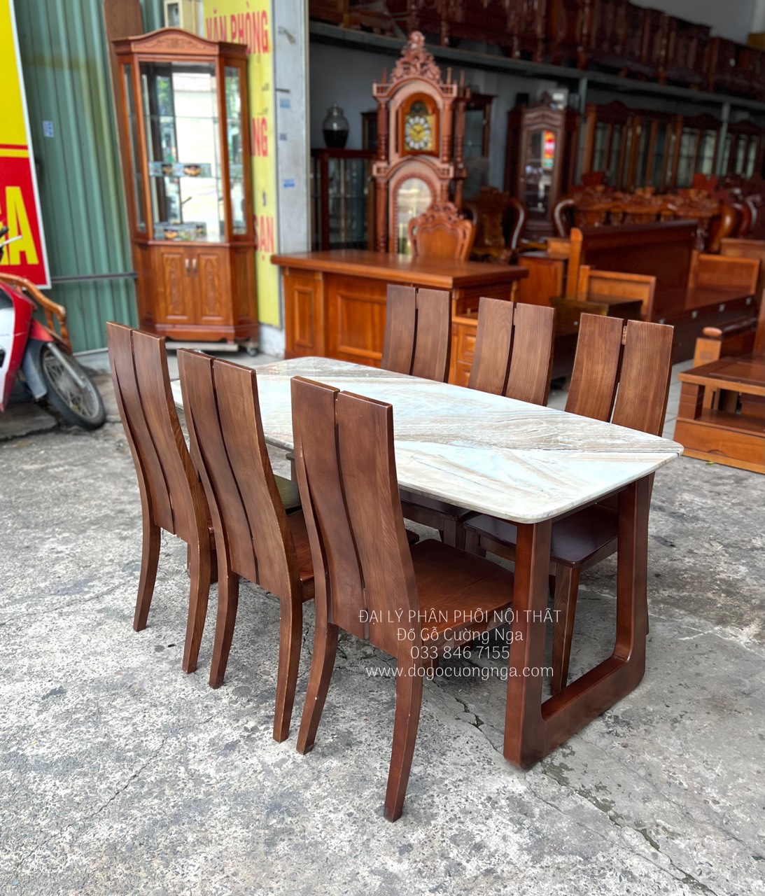 Video bàn ăn gỗ sòi mặt đá hiện đại 6 ghế