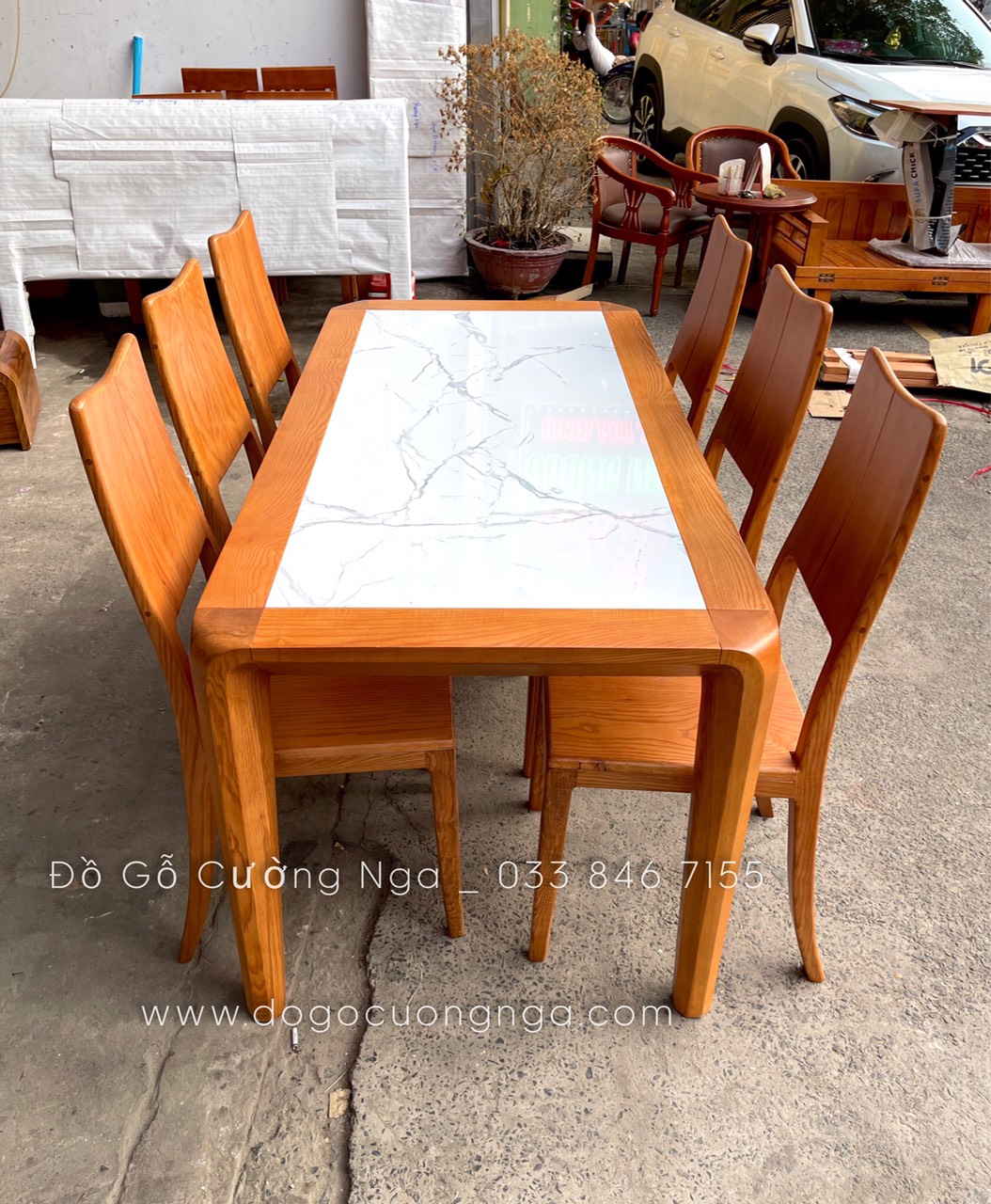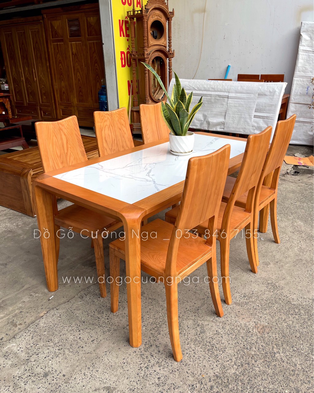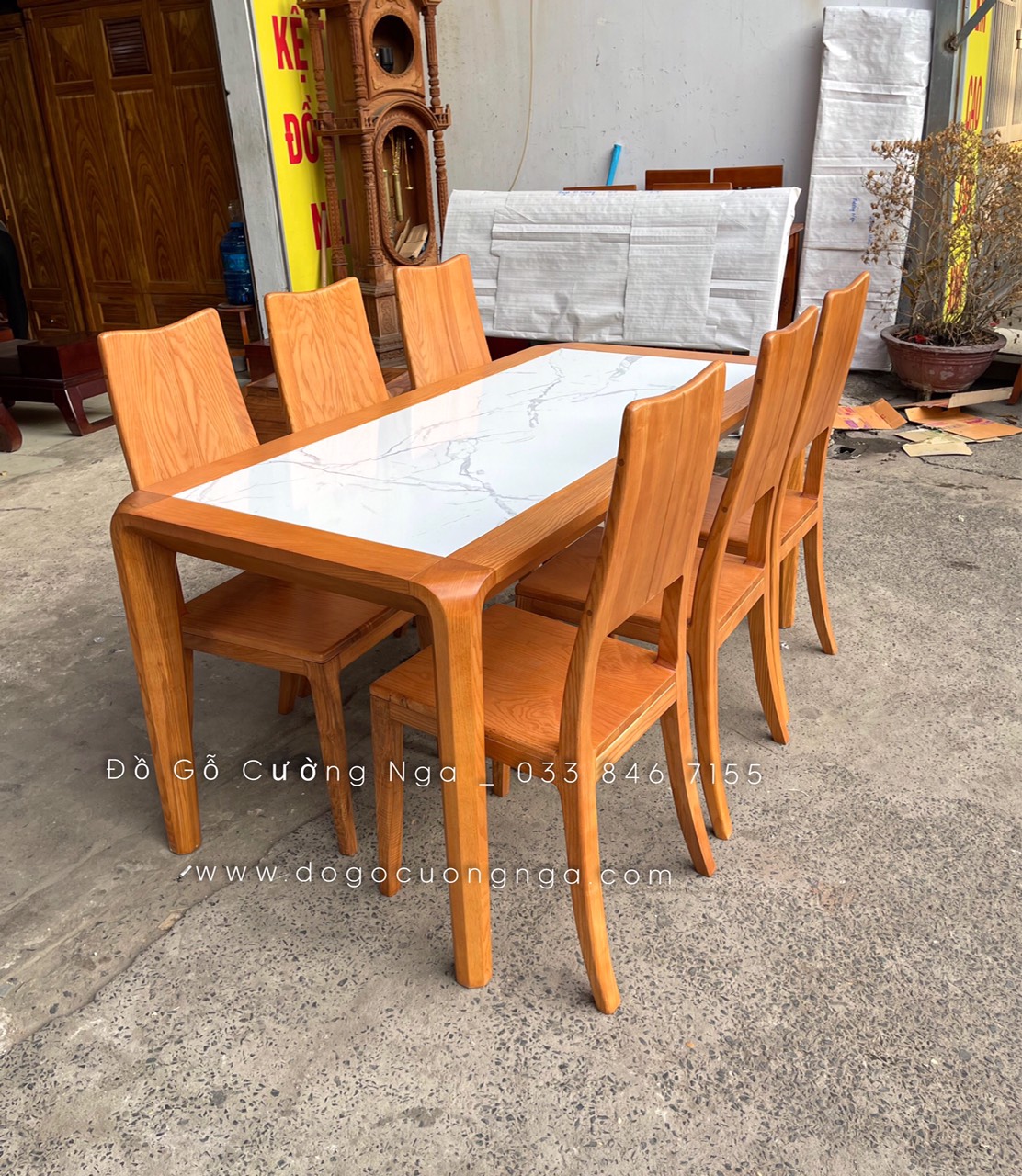 Video thực tế mẫu bàn ăn gỗ Sồi Nga mặt đá hiện đại 6 ghế