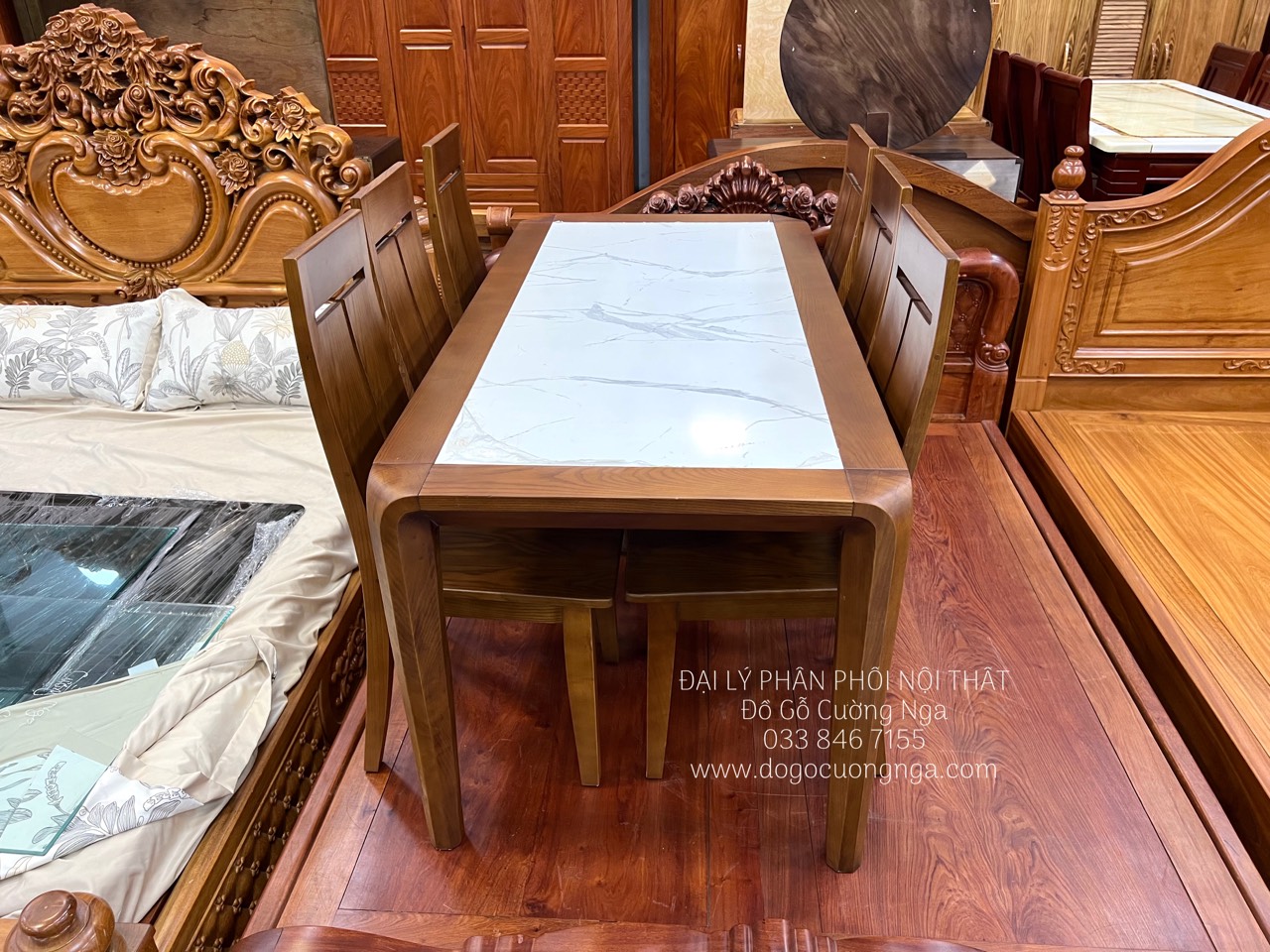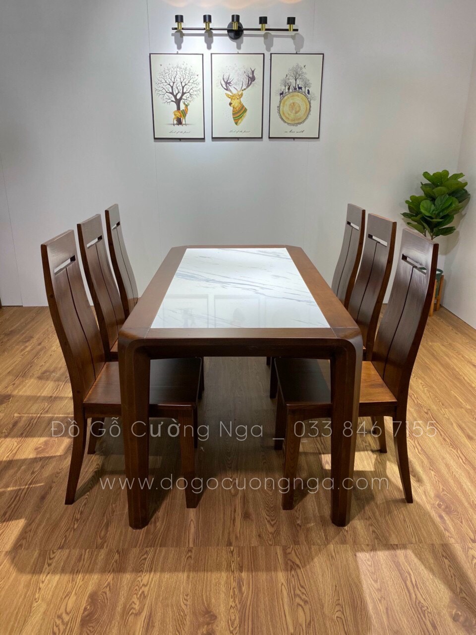 Bộ bàn ăn gỗ sồi nga mặt đá 6 ghế - màu óc chó giá rẻ đẹp
