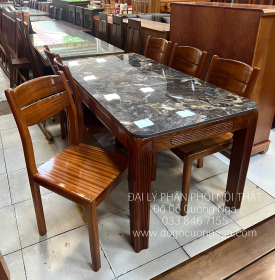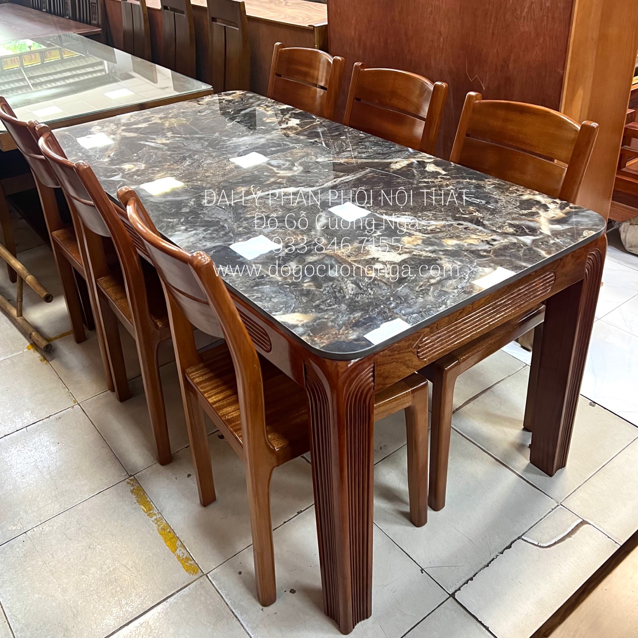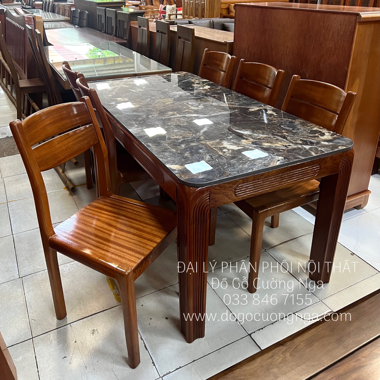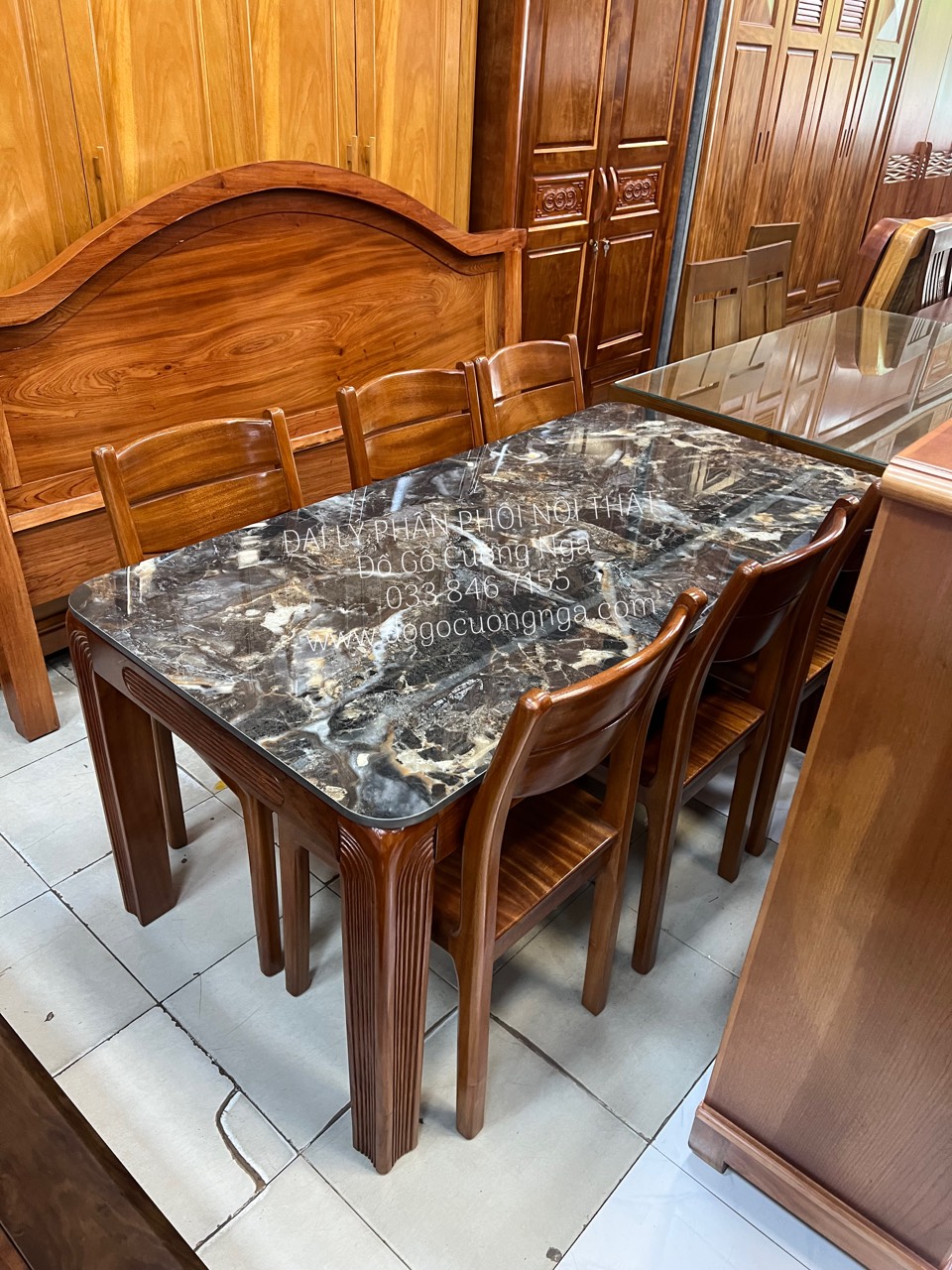 Bộ bàn ăn 6 ghế gỗ xoan đào mặt đá trống trầy