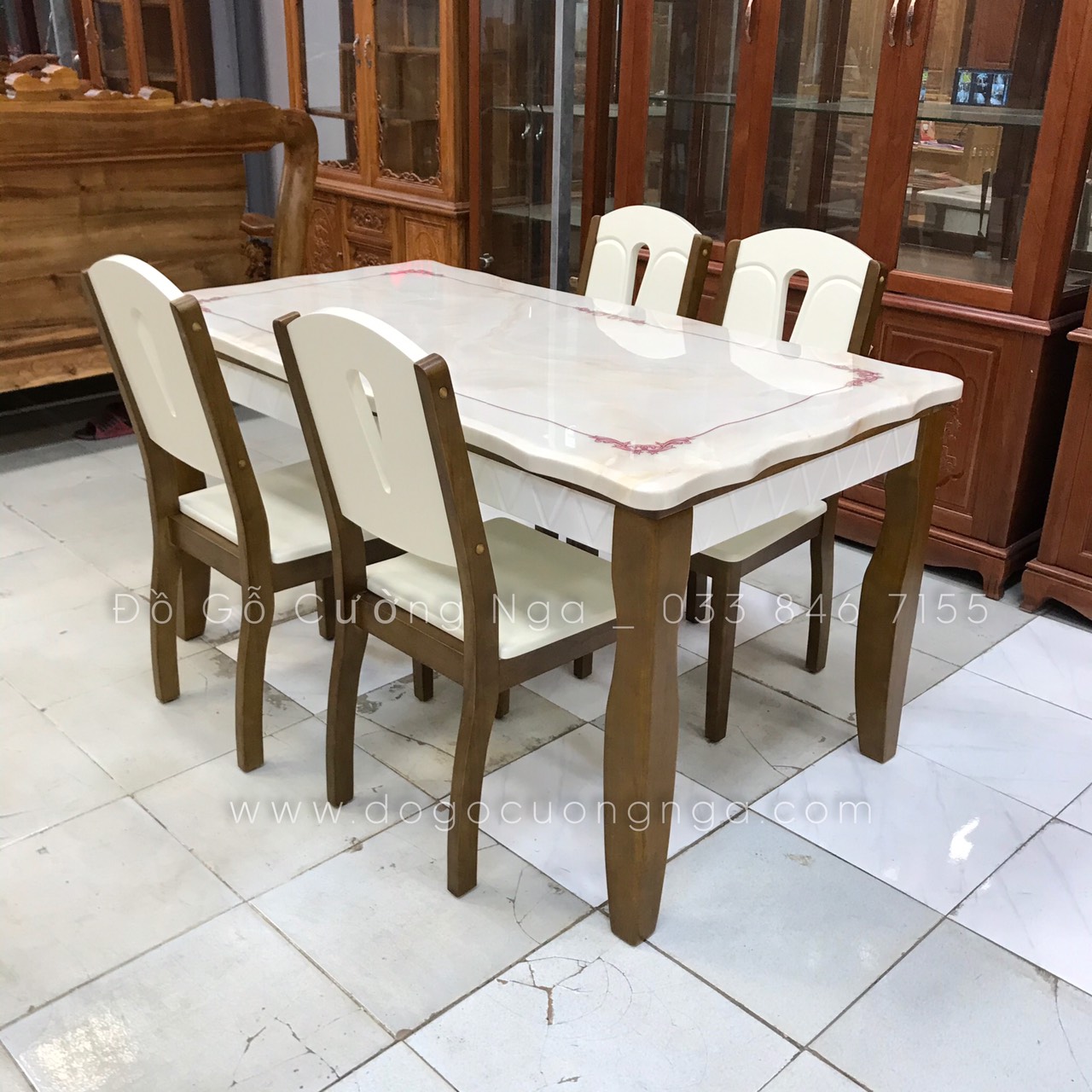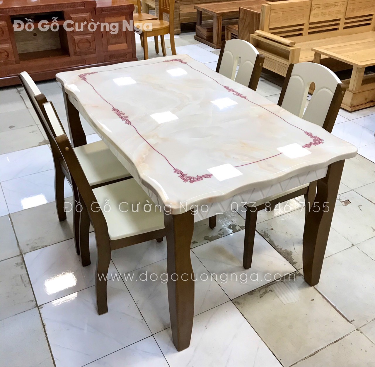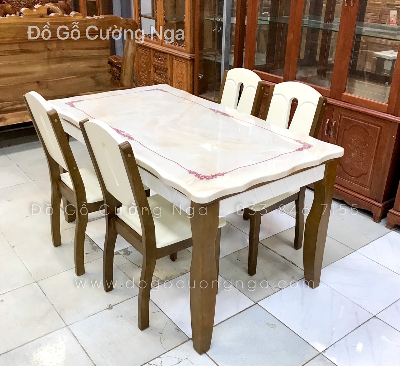 Bộ bàn ăn mặt đá chữ nhật 4 ghế với vân màu đá loang hài hòa tự nhiên, dòng đá mới nhất hiện nay, cùng kích thước đặc biệt, không có mặt rộng rãi trên thị trường tạo nên sức hút rất riêng, sản phẩm đã có mặt tại Đồ Gỗ Cường Nga