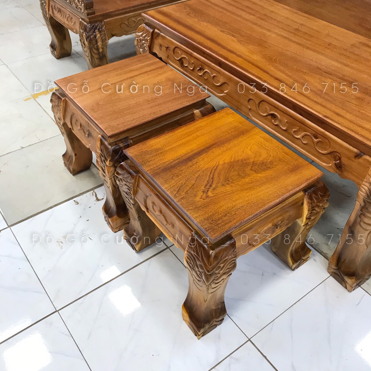 Bộ bàn ghế salon gỗ Tràm tay 12 chạm bát tiên bao gồm 1 ghế băng dài, 2 ghế đơn, 2 ghế đôn . Sản phẩm được lựa chọn từ những khối gỗ dày đặc mặt ghế mặt bàn làm liền tấm và nguyên khối giúp đảm bảo độ chắc chắn của sản phẩm, tạo nên một sản phẩm hoàn hảo, chịu lực tốt.