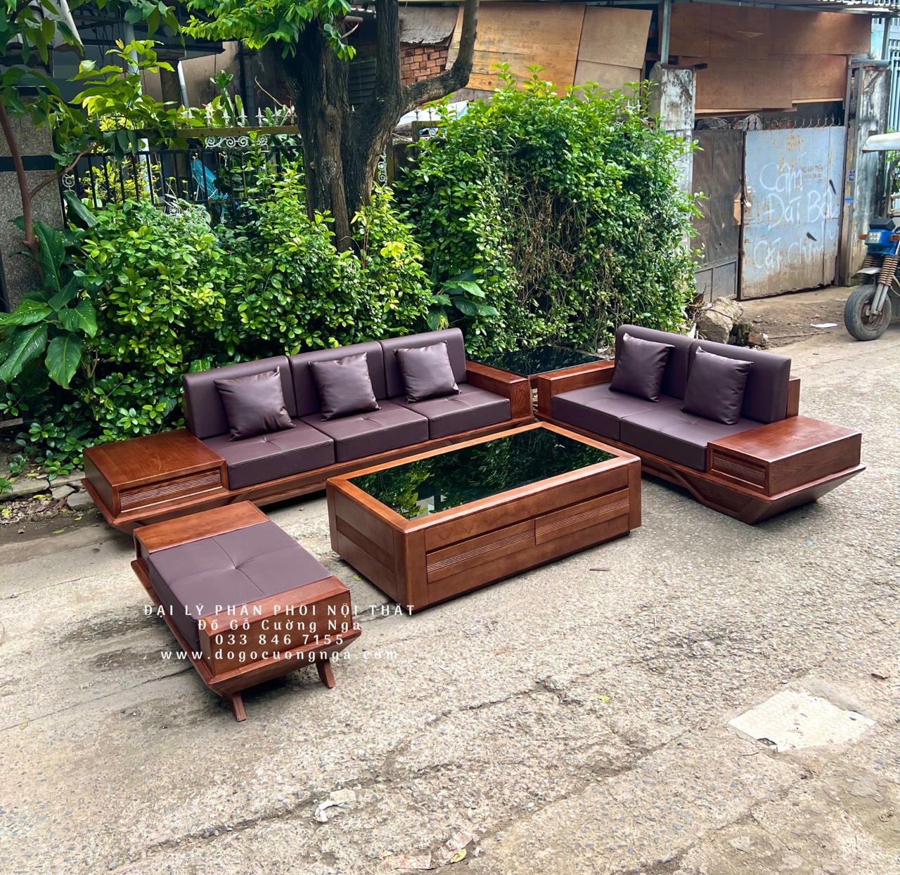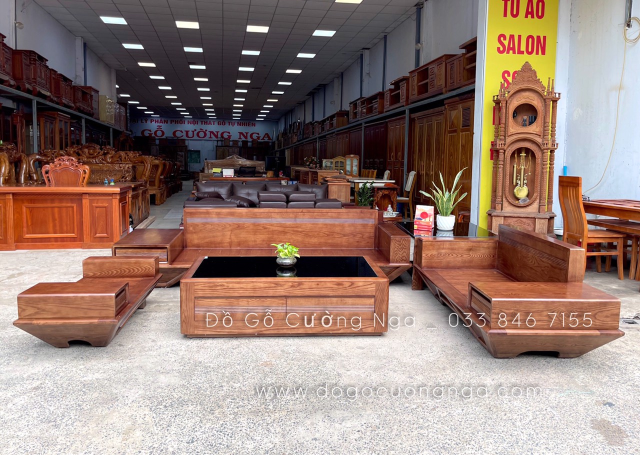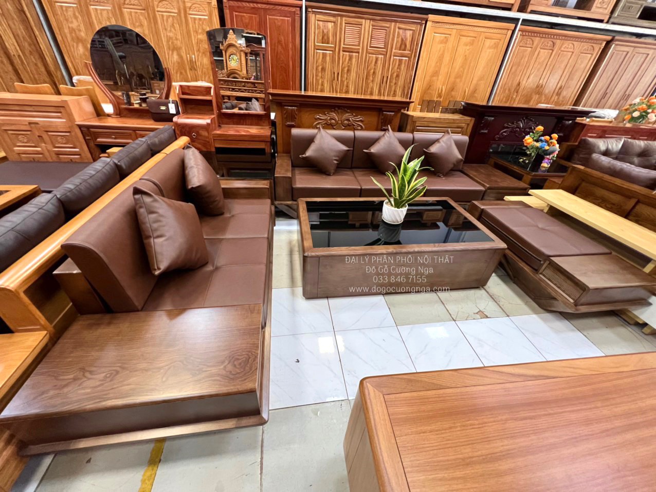 Bộ Bàn Ghế Sofa 2 Văng Thuyền Gỗ Sồi Nga Lau Màu Óc Chó Kèm Nệm