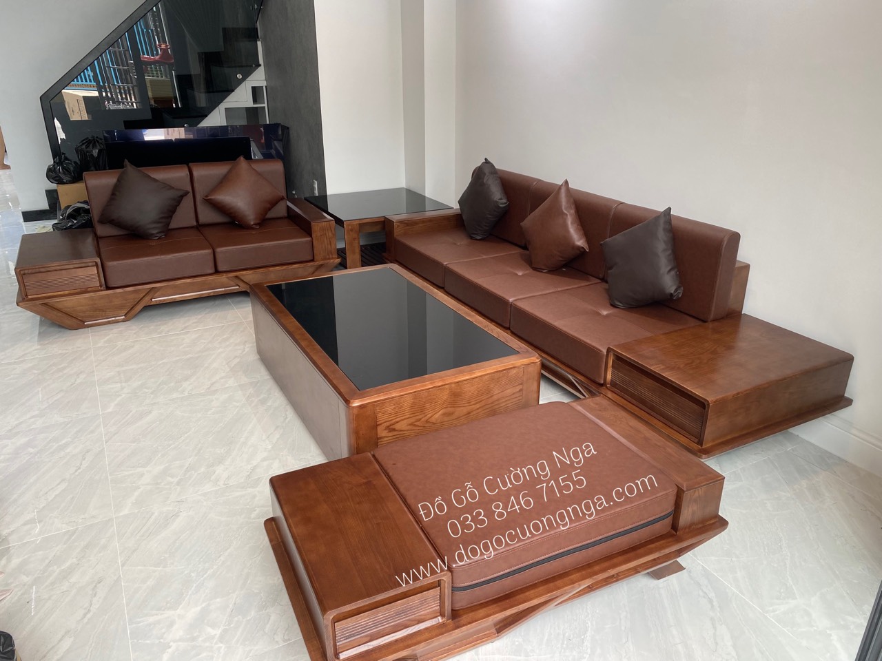 Bộ Sofa Gỗ Sồi Nga Góc L Chân Thuyền 2m8x1m9 Màu Óc Chó Sang Trọng
