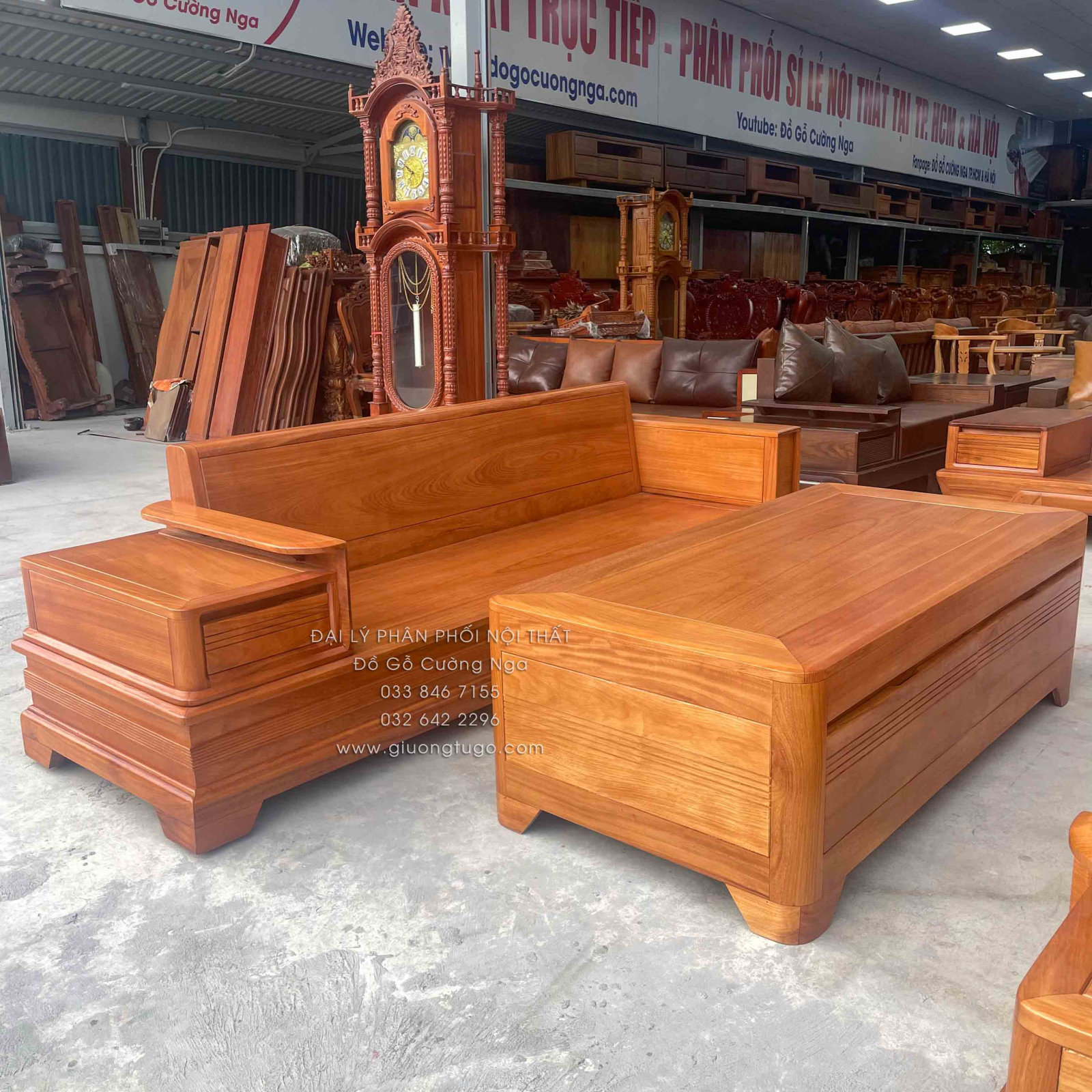 Bộ Sofa Gỗ Sồi Nga Góc L Chân Thuyền 2m8x1m9 Màu Óc Chó Sang Trọng