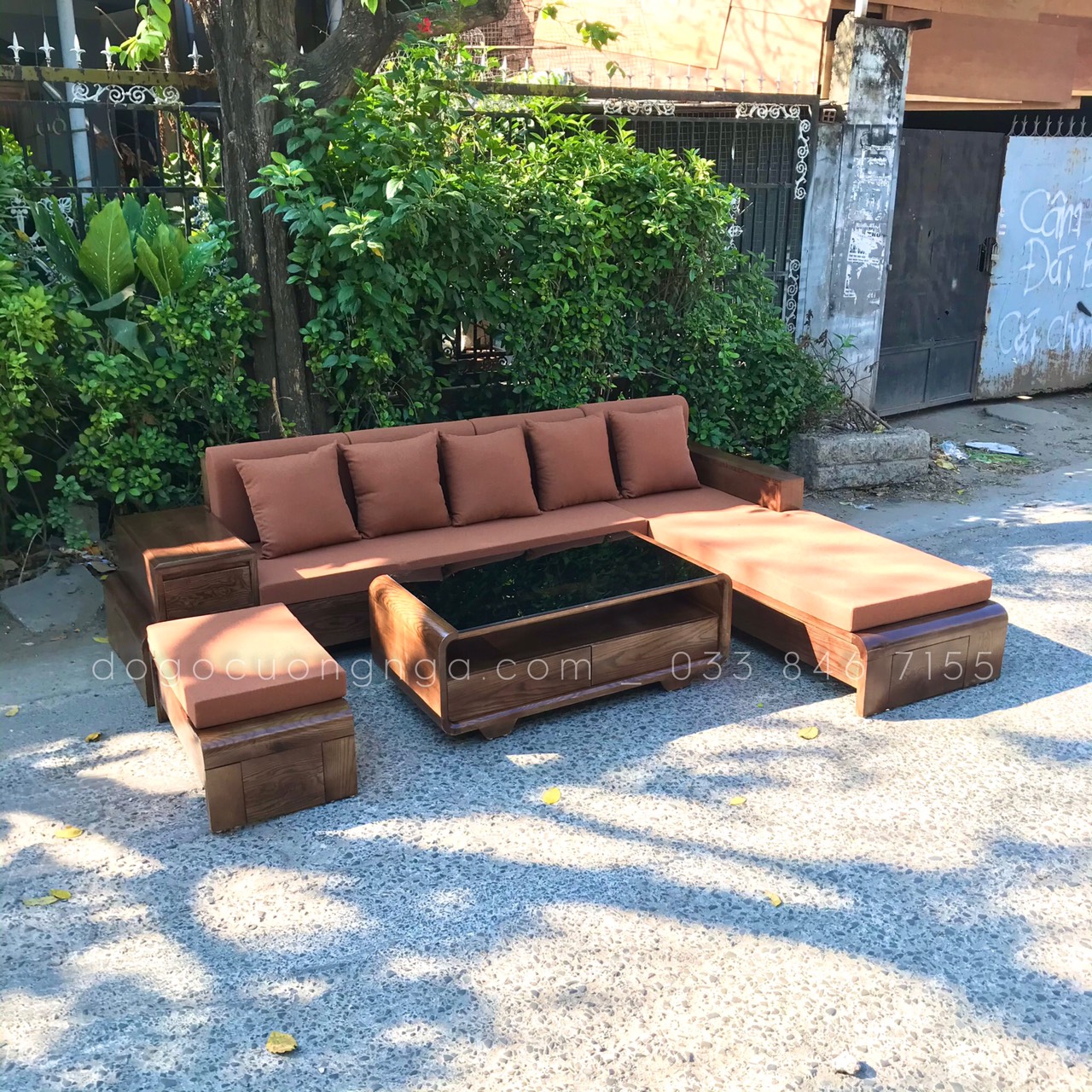 Bộ Sofa Gỗ Sồi Nga Góc L Chân Thuyền 2m8x1m9 Màu Óc Chó Sang Trọng