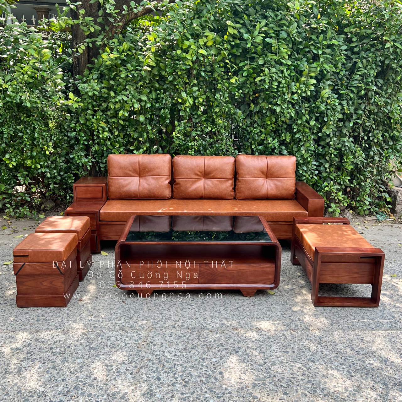 Bộ Bàn Ghế Sofa Gỗ Sồi Nga Lau Màu Óc Chó Văng 5 Món Hiện Đại