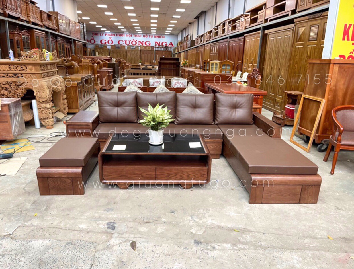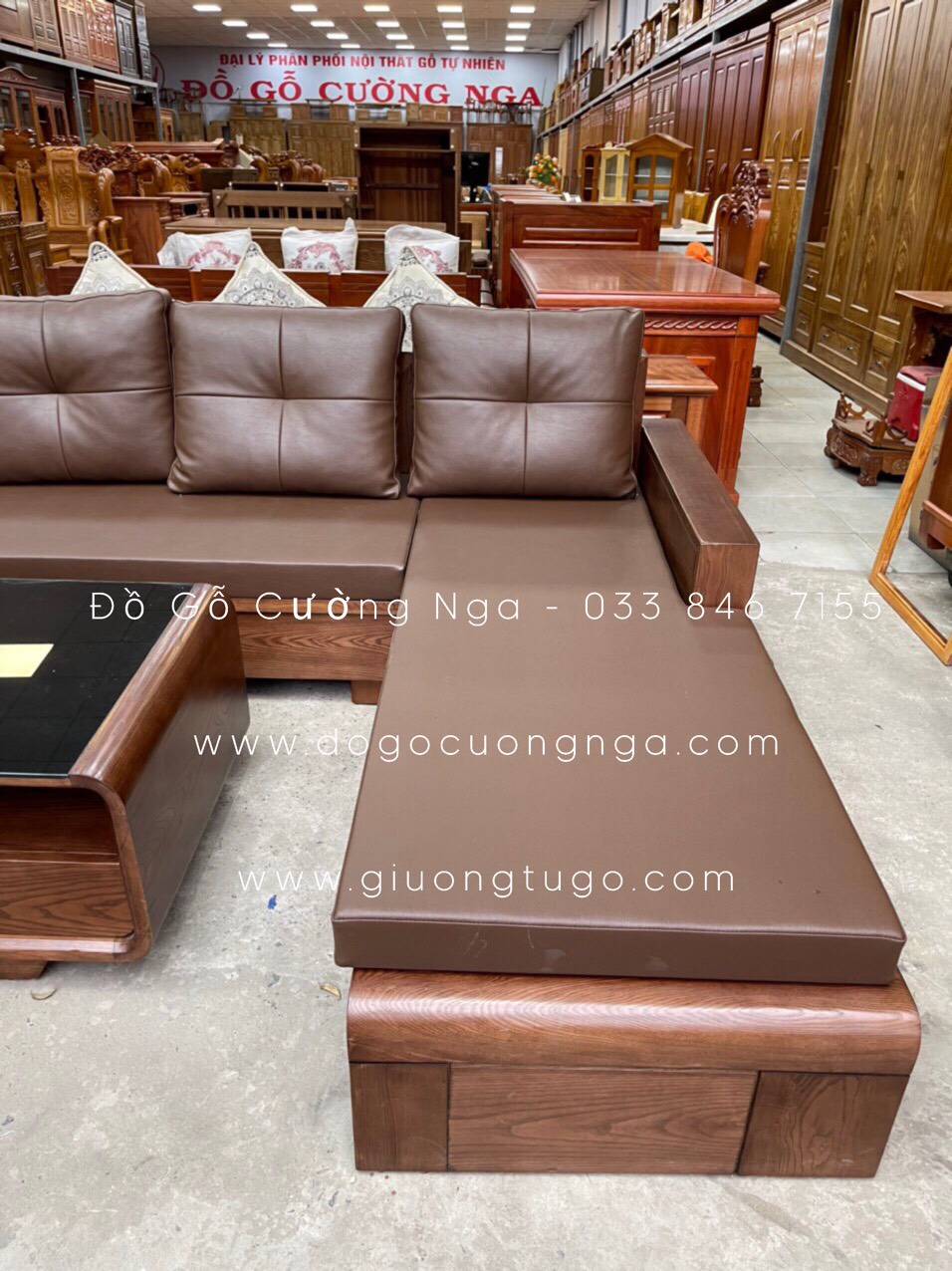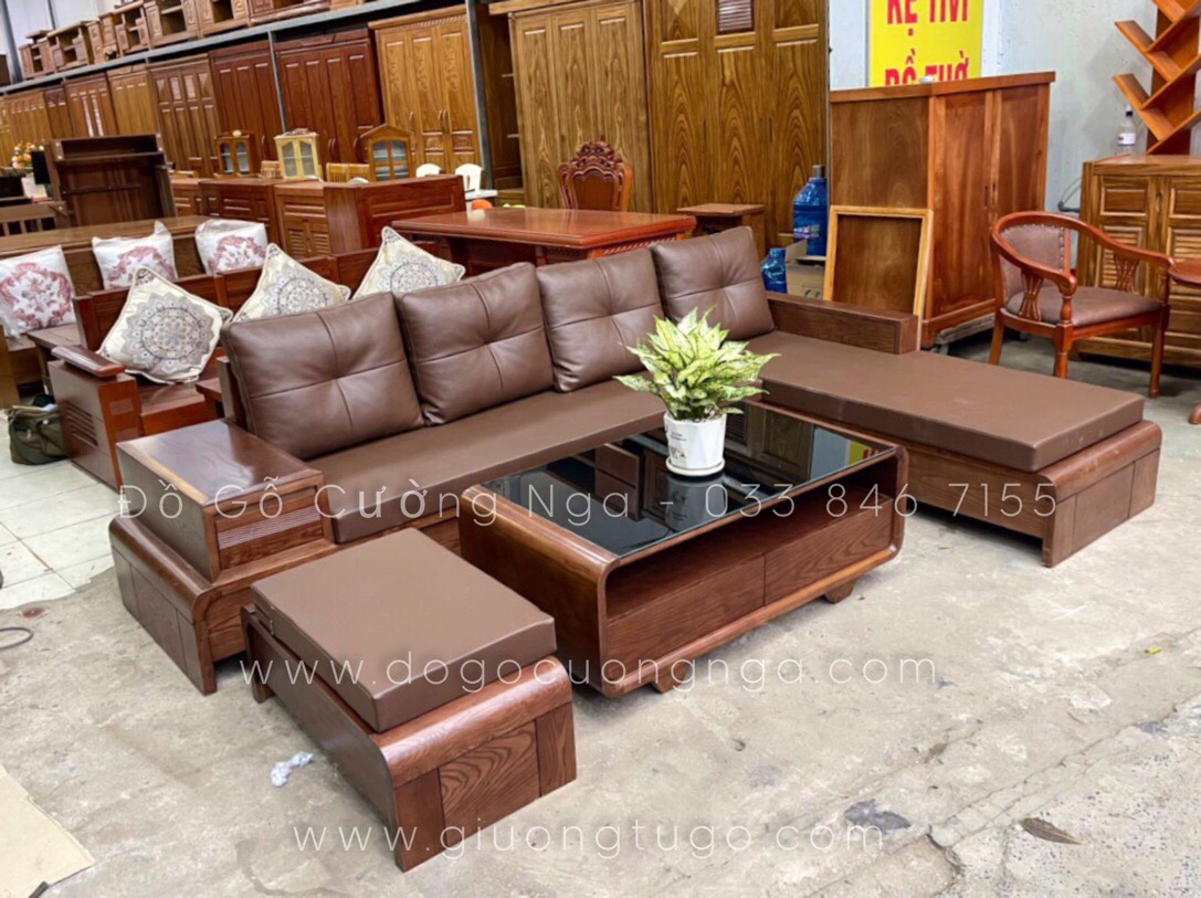 Bộ Sofa Gỗ Sồi Nga Góc L Chân Thuyền 2m8x1m9 Màu Óc Chó Sang Trọng