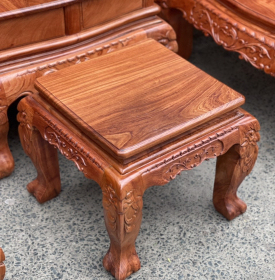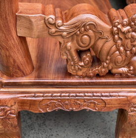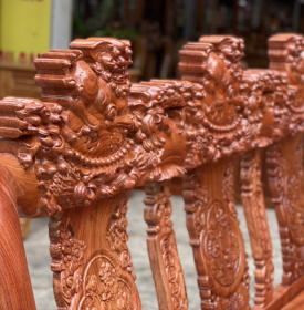 Bàn ghế gỗ hương đá chạm Nghê hạt, bao gồm 1 ghế dài, 2 ghế đơn , 1 bàn , và 2 đôn, 1 đôn kẹp khi cần thiết 1 đôn có thể để bình hoa trưng, tất cả điều làm dày đặc của từng khối gỗ, giúp đảm bảo độ chắc chắn của sản phẩm chịu lực.