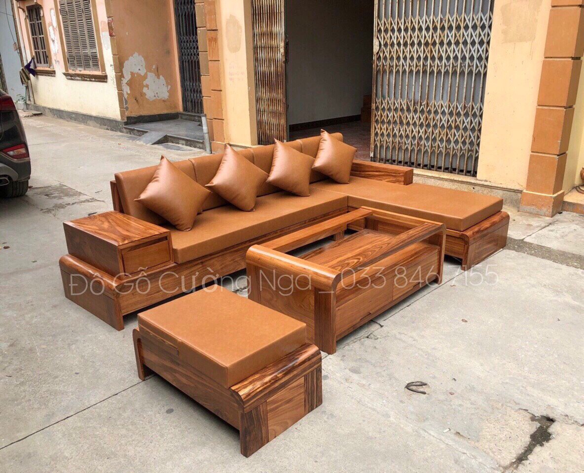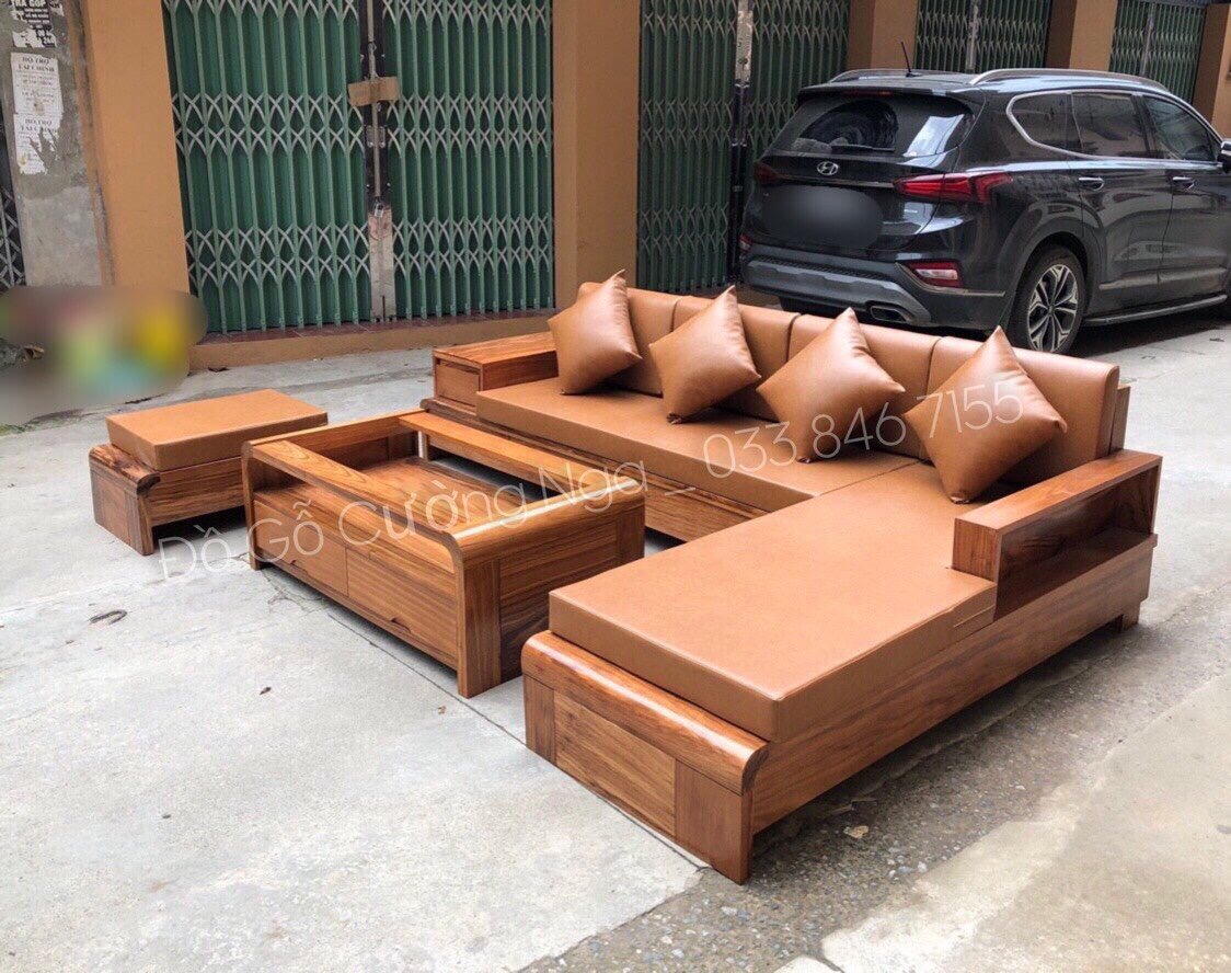 Bộ Sofa Gỗ Sồi Nga Góc L Chân Thuyền 2m8x1m9 Màu Óc Chó Sang Trọng