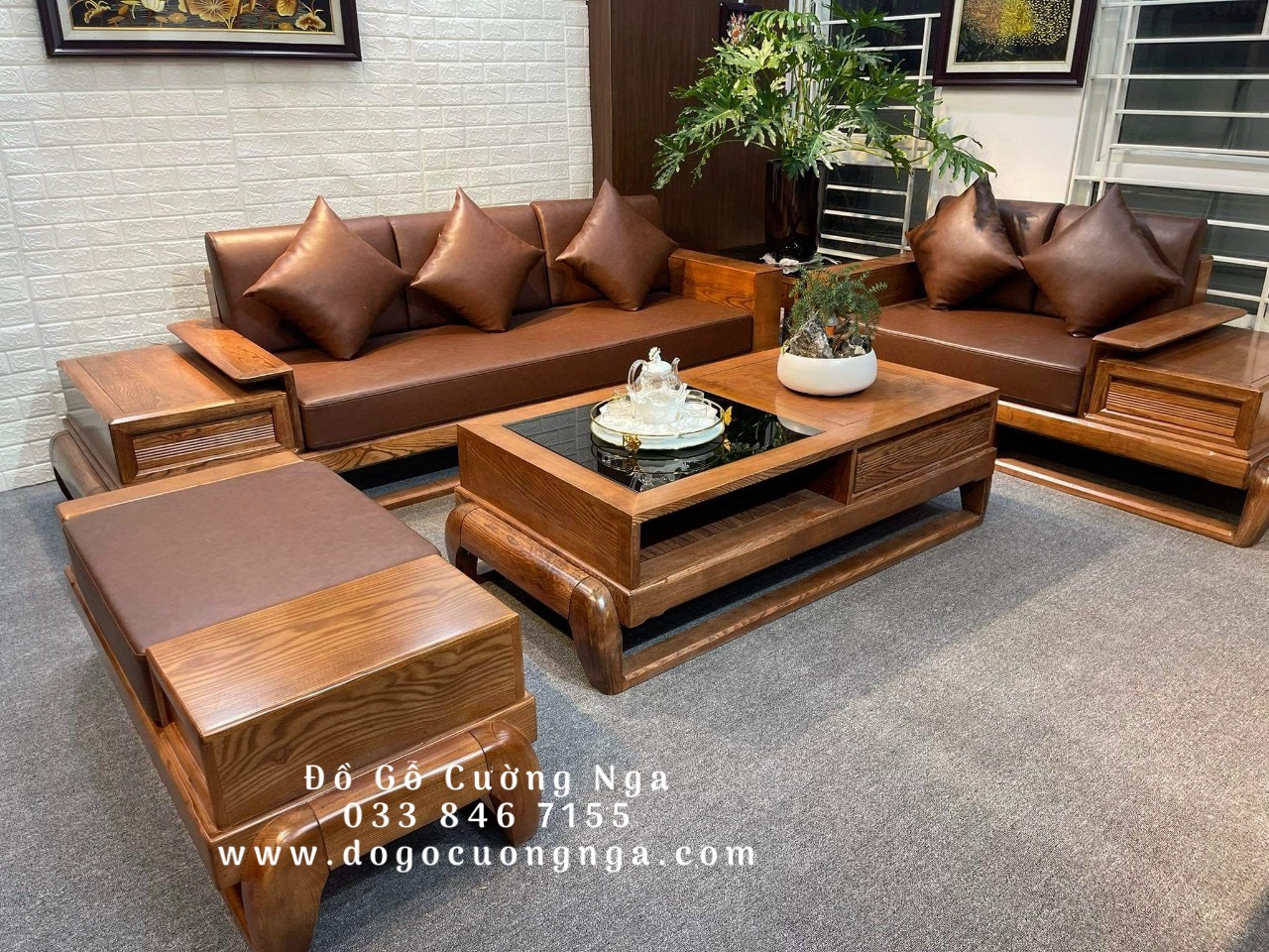 Bộ Sofa Gỗ Sồi Nga Lau Màu Hương 2 Văng Đùi Gà
