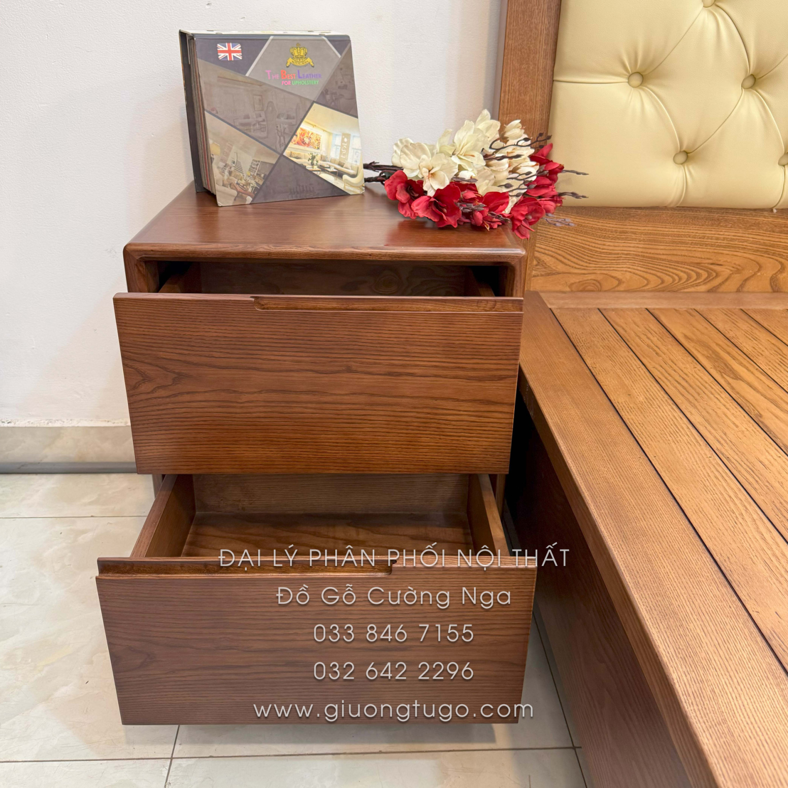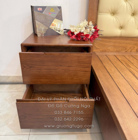Chiếc tủ tab 2 ngăn kéo được thiết kế đi kèm với giường, giúp anh chị tiện tay đặt các vật dụng cá nhân như điện thoại, đồng hồ, đèn ngủ hay sách báo một cách ngăn nắp.