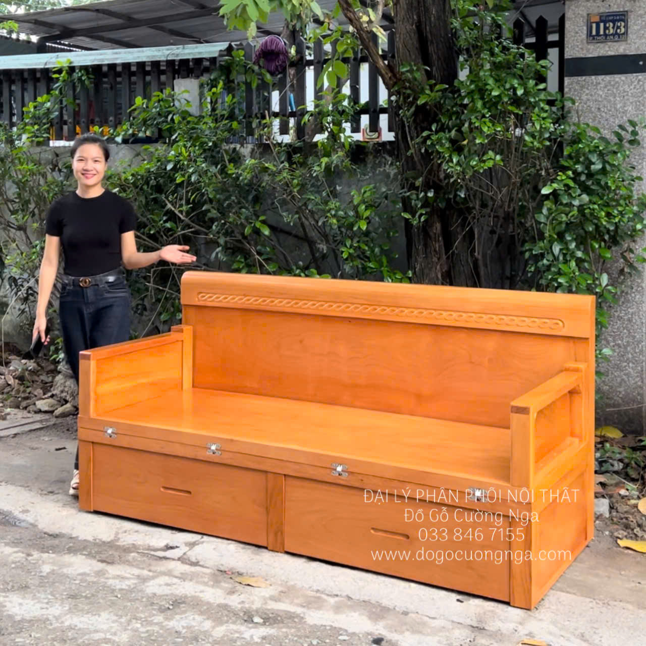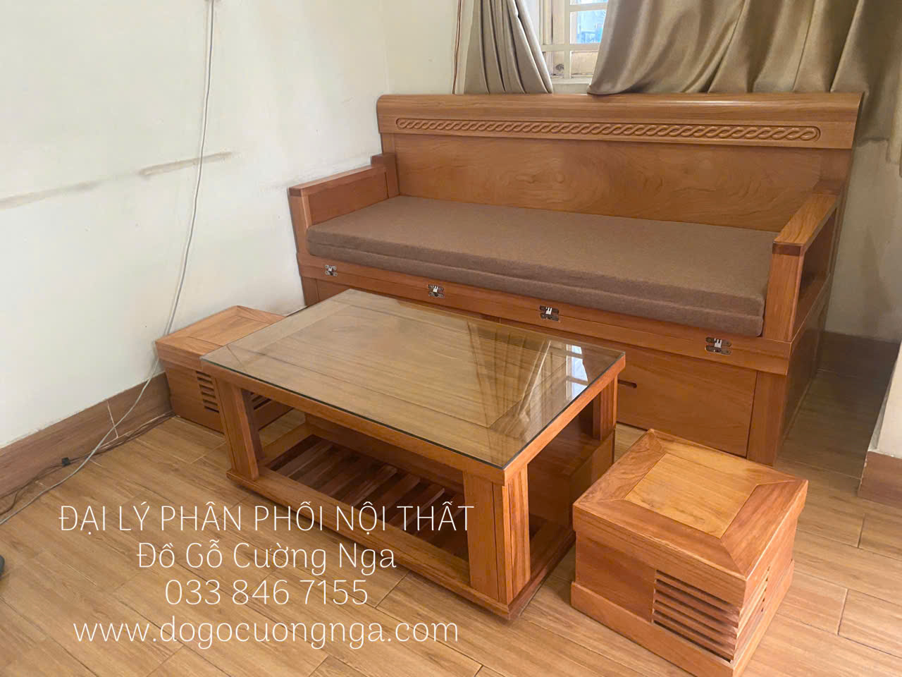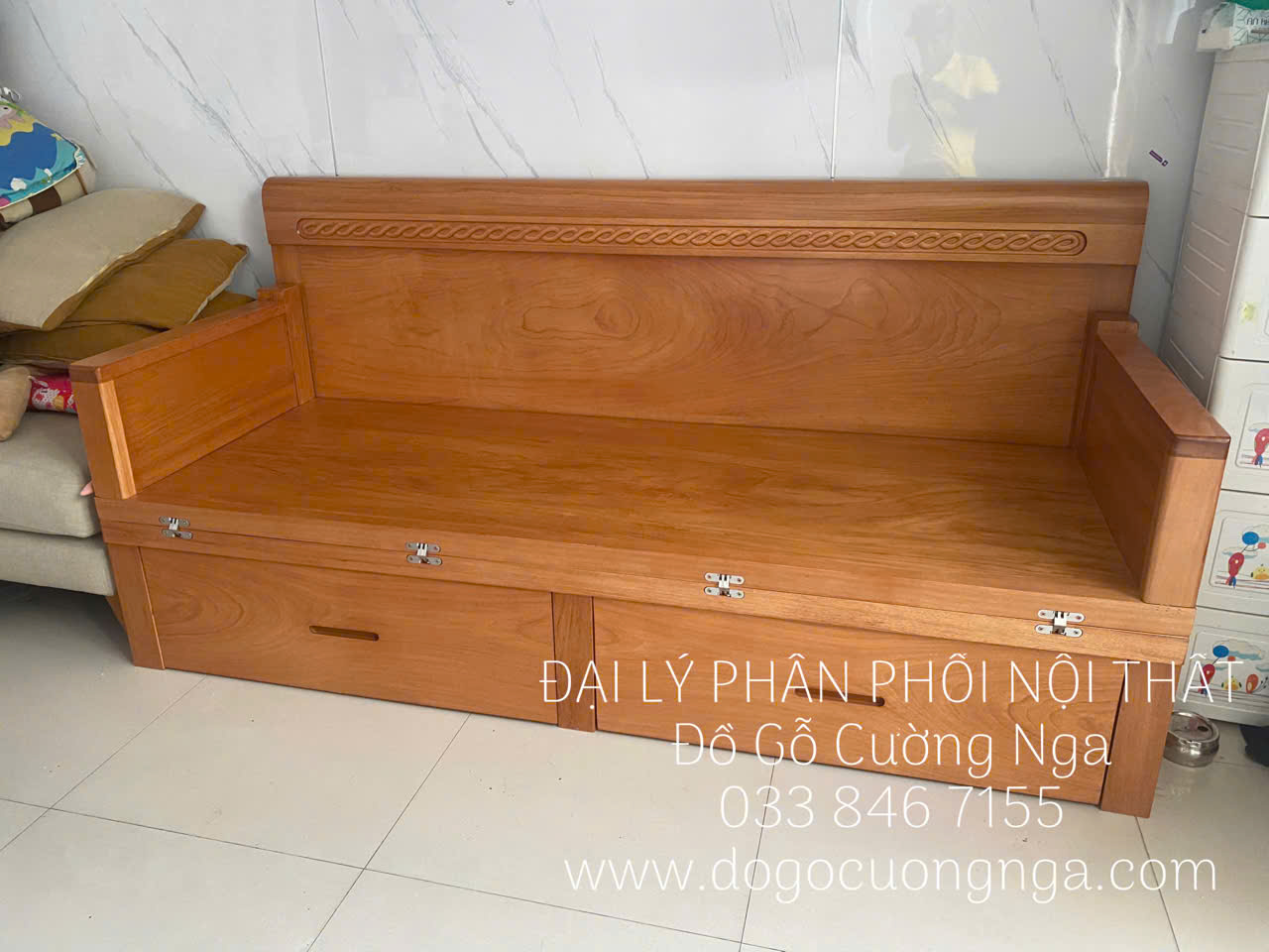 Giường gấp gỗ gõ đỏ 2 ngăn kéo kèm bàn sofa đôn và nệm