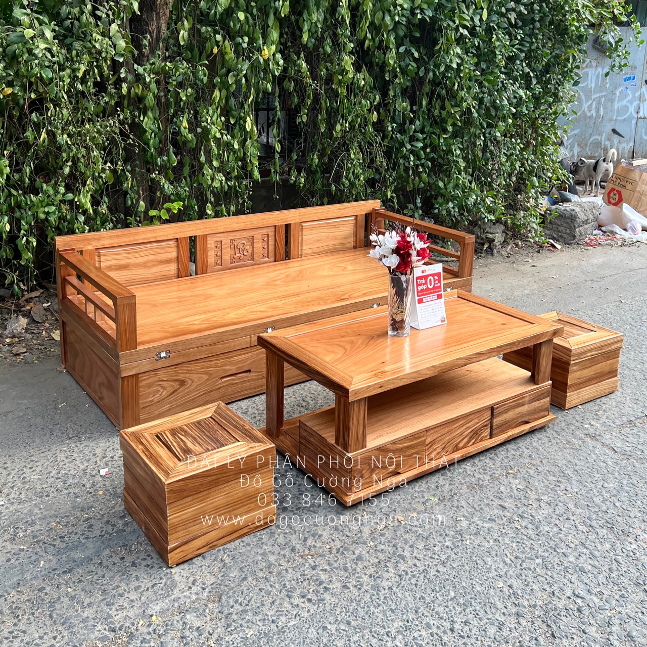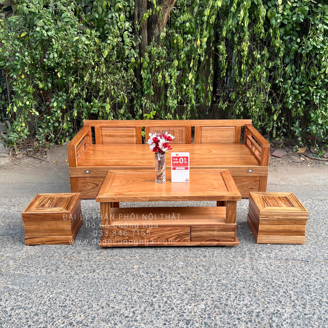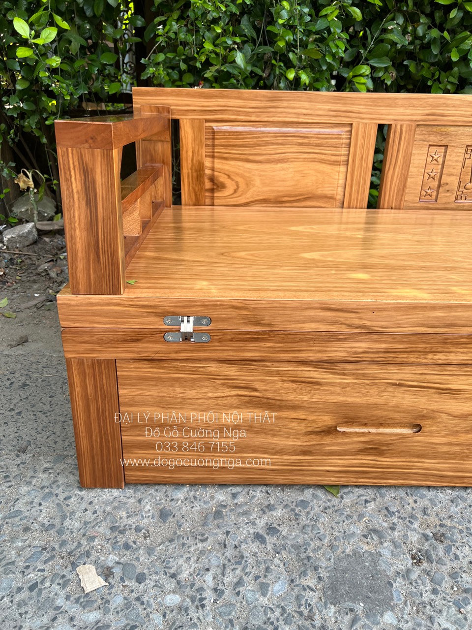 Giường Gấp Gỗ Hương Xám Ngăn Kéo Kèm Bàn Trà Gỗ Đôn Ngồi Cao Cấp
