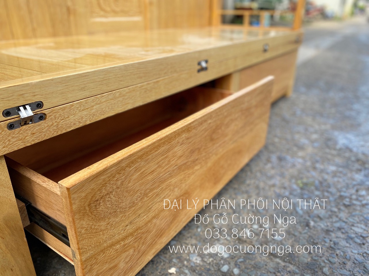 Giường Gấp Gỗ Xoan Đào 2 Ngăn Kéo Kèm Bàn (Có Kính) & Đôn Gỗ Sồi Bền Đẹp