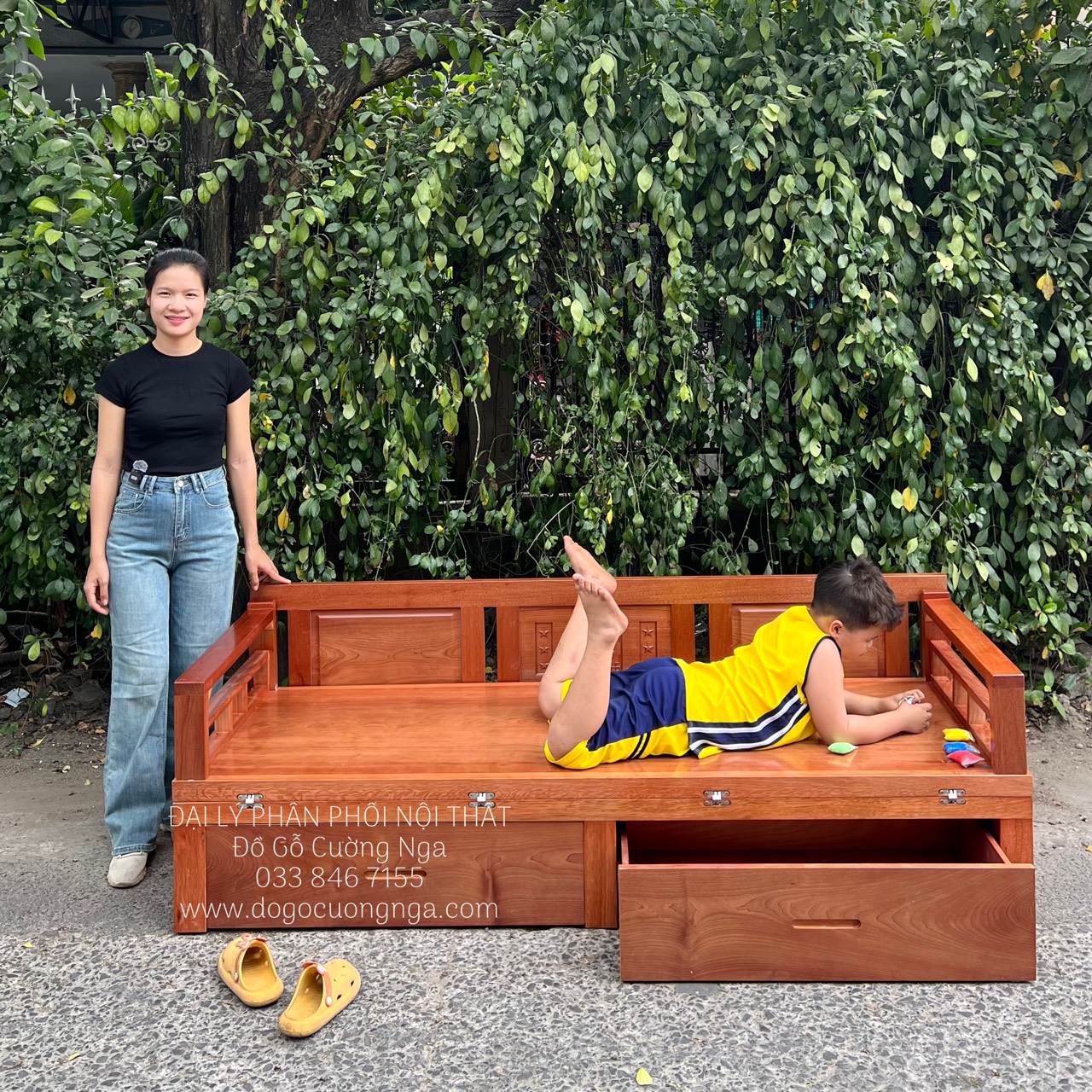 Giường gấp gỗ xoan đào 2 ngăn kéo giao khách