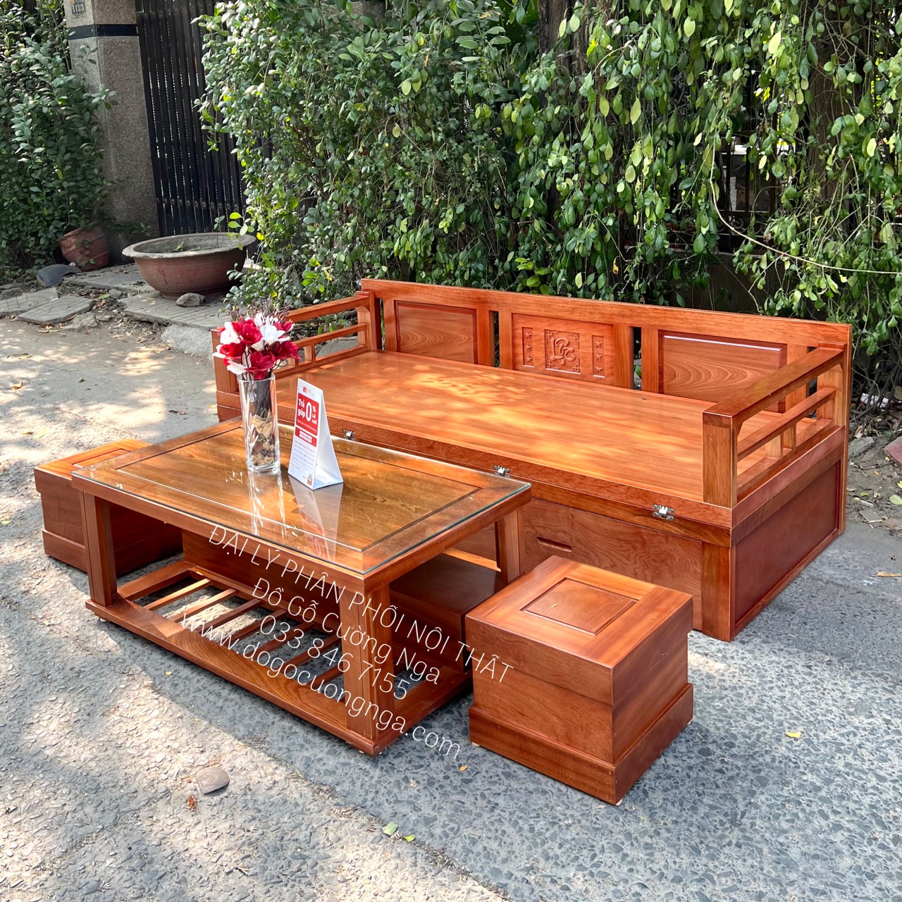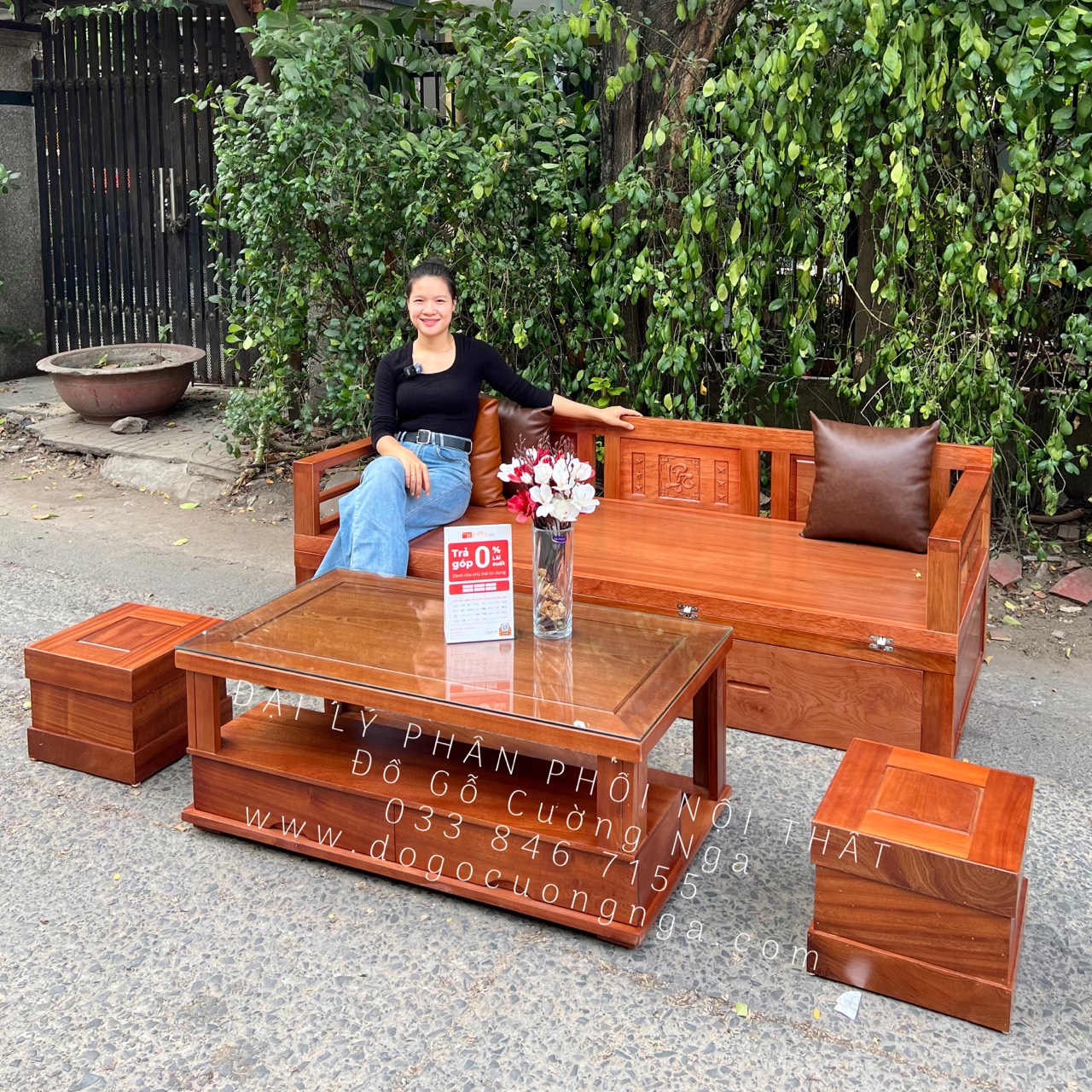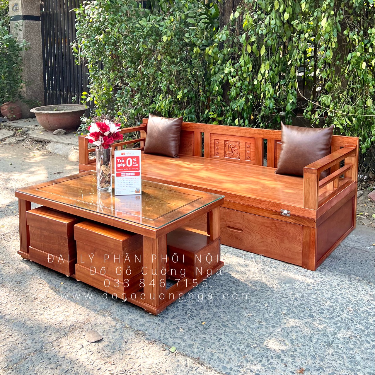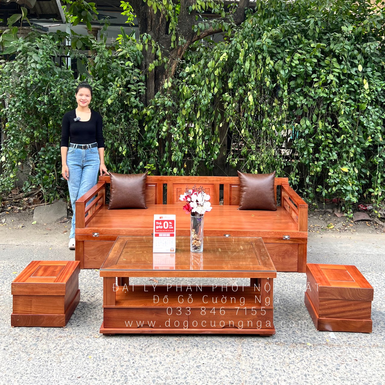 Kích thước giường ghế gỗ xoan đào + bàn trà gỗ 4 món