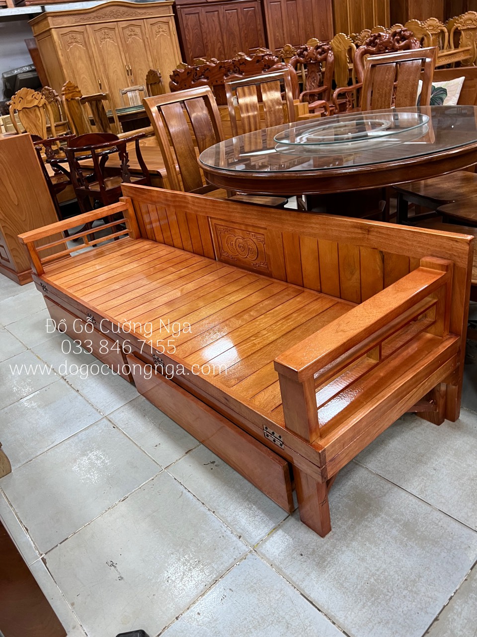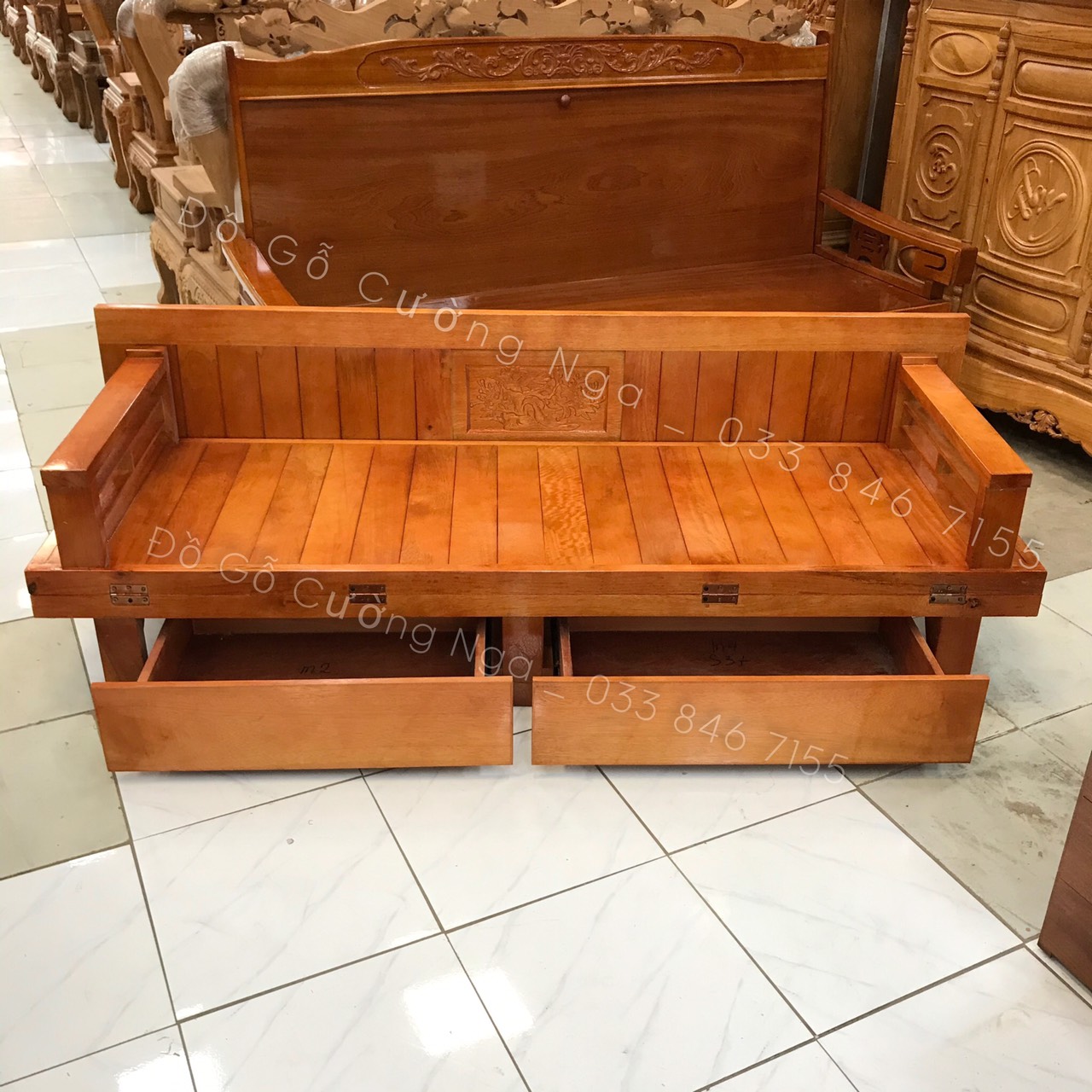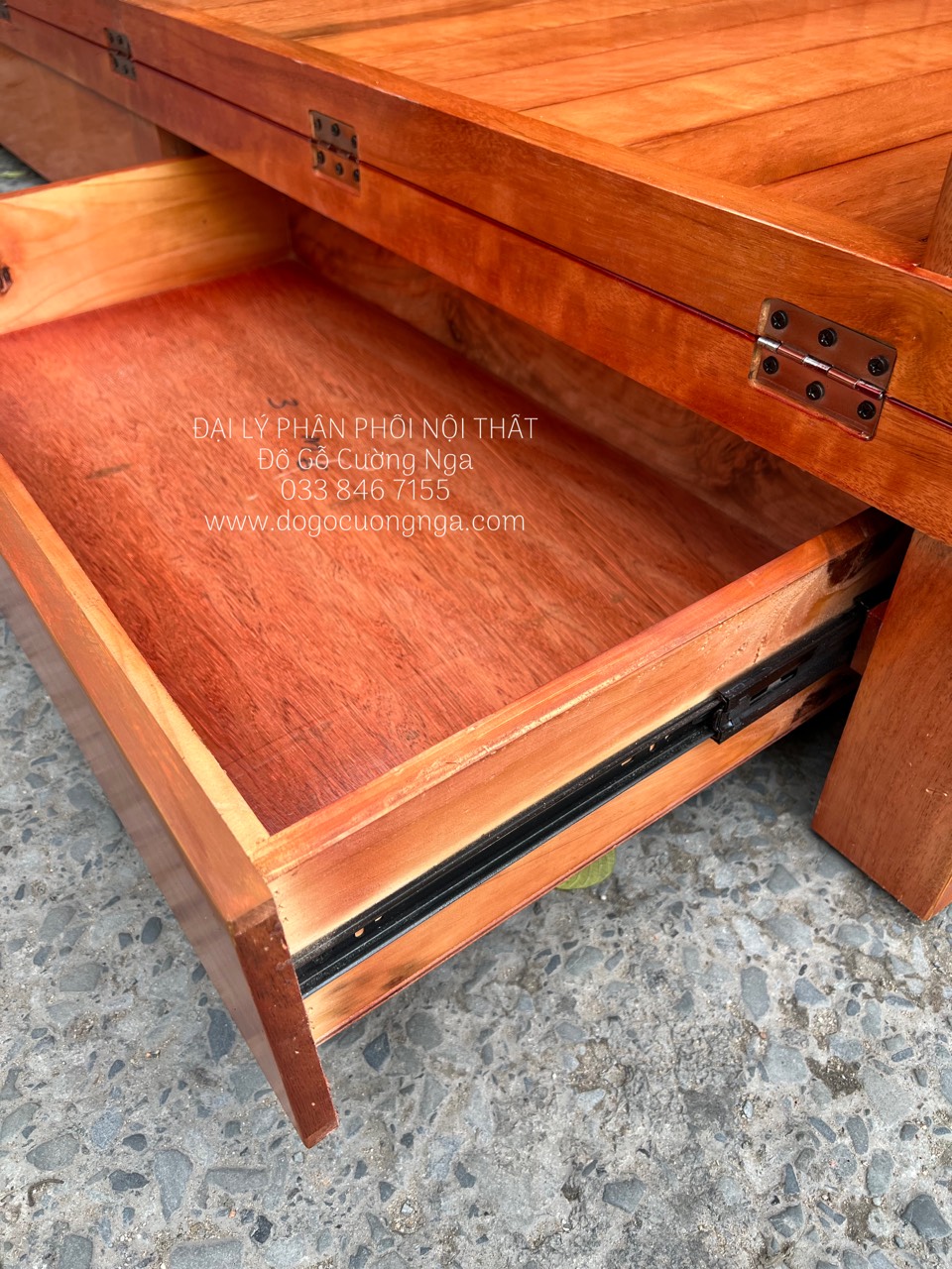 Giường Gấp Gỗ Xoan Đào 2 Ngăn Kéo Kèm Bàn (Có Kính) & Đôn Gỗ Sồi Bền Đẹp