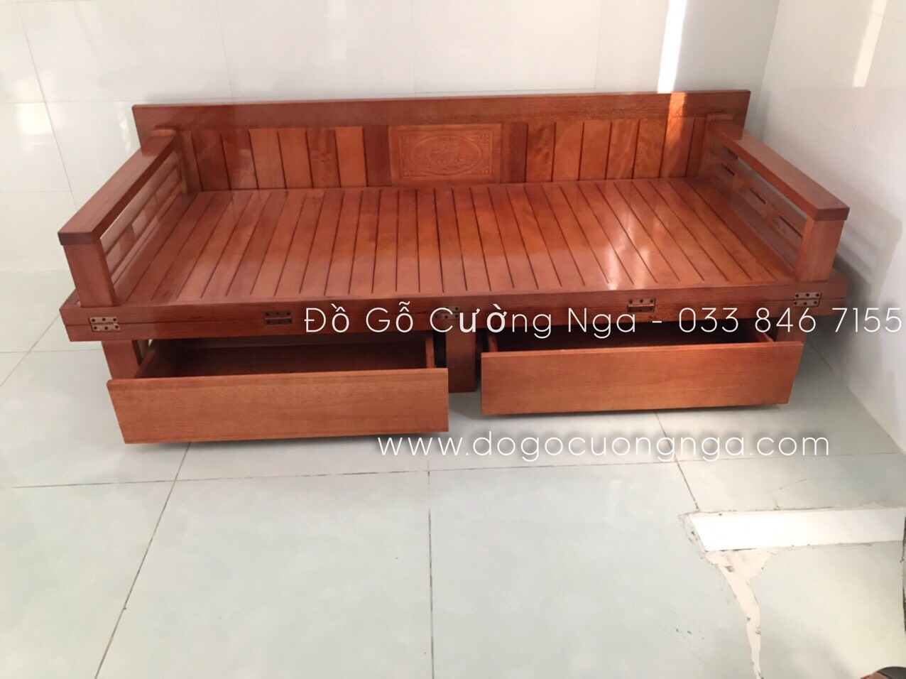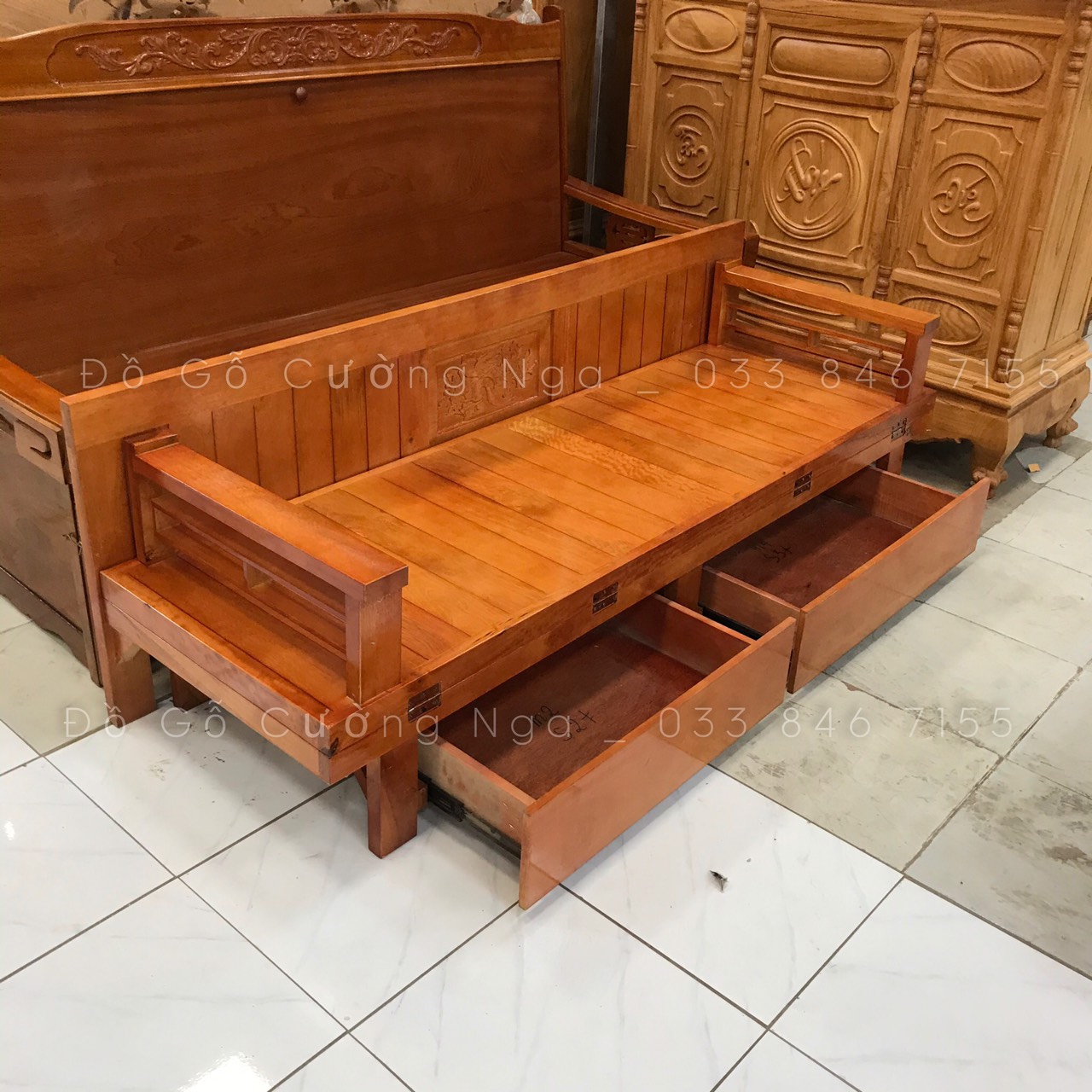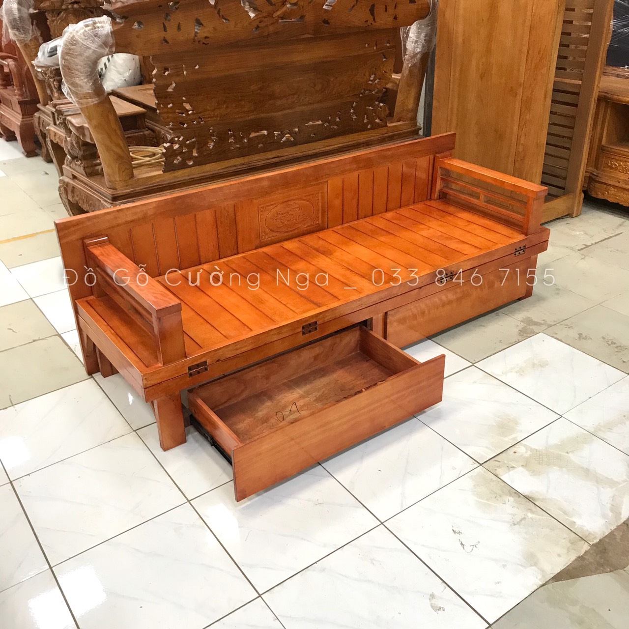 Giường Gấp Gỗ Xoan Đào 2 Ngăn Kéo Kèm Bàn (Có Kính) & Đôn Gỗ Sồi Bền Đẹp