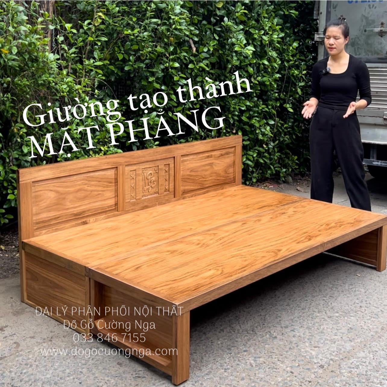 Giường Gấp Gỗ Xoan Đào 2 Ngăn Kéo Kèm Bàn (Có Kính) & Đôn Gỗ Sồi Bền Đẹp